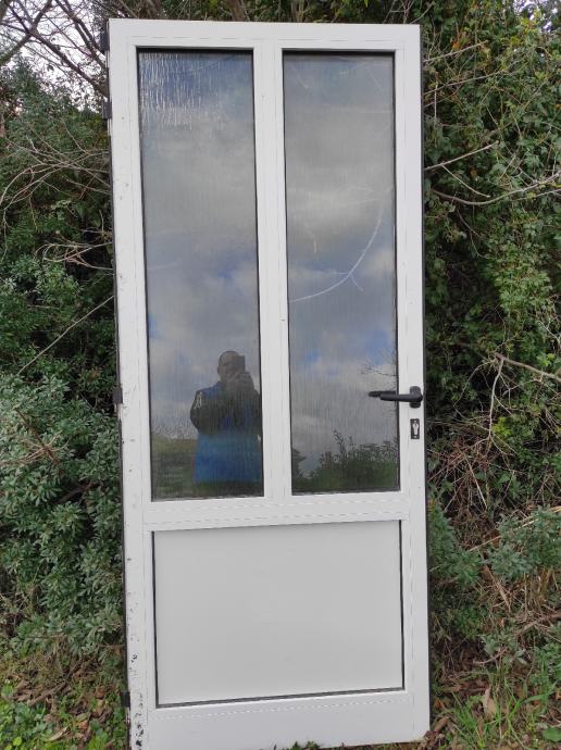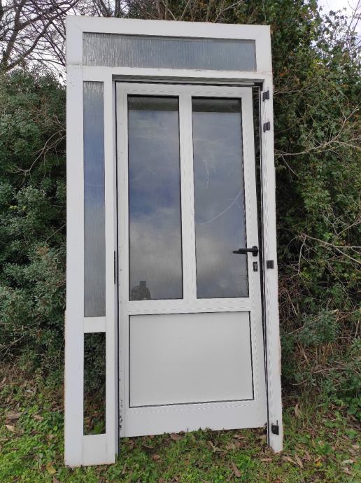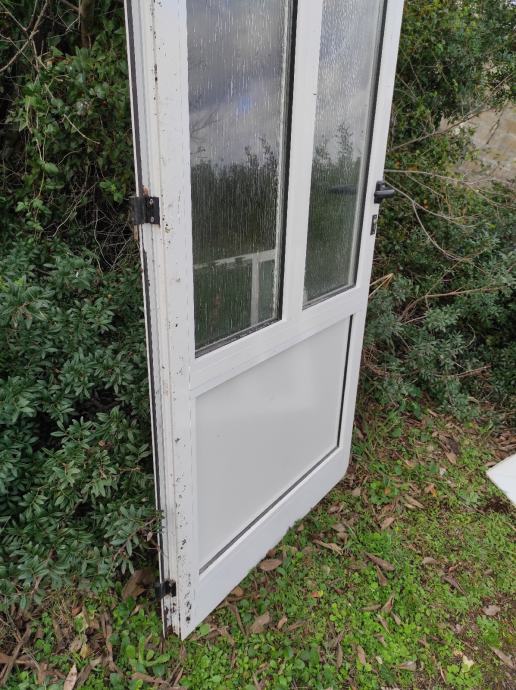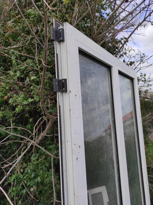 Alu ulazna vrata, bijela, dimenzije vrata i štoka na slikama, štok na jednom mjestu oštećen prilikom skidanja, fali jedno staklo na štoku, cijena 60 eura, moguća dostava autoprikolicom unutar 20tak kilometara, 0959012318, viber, whatsapp, u Puli.