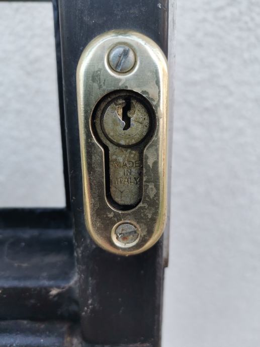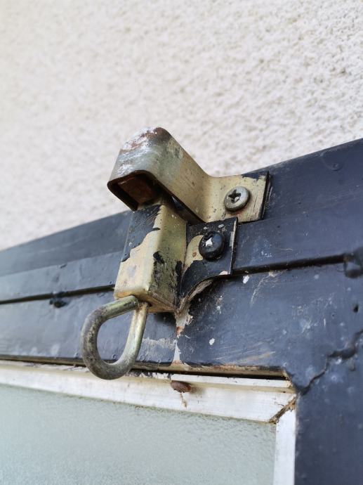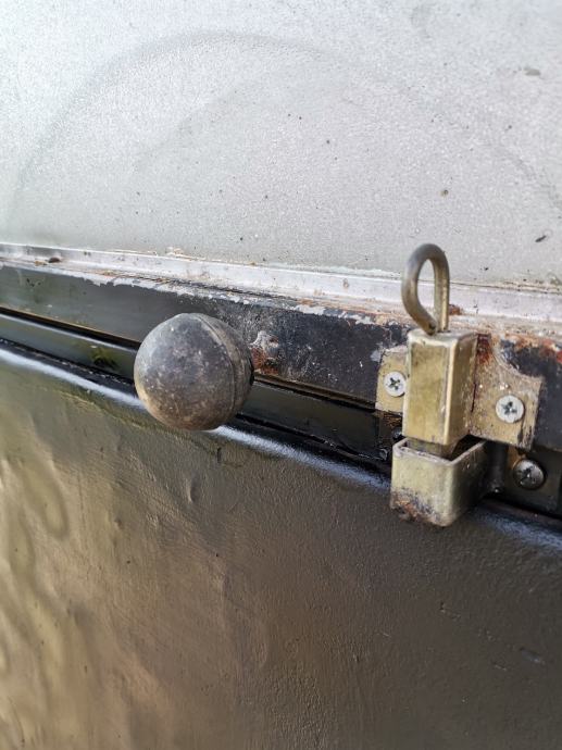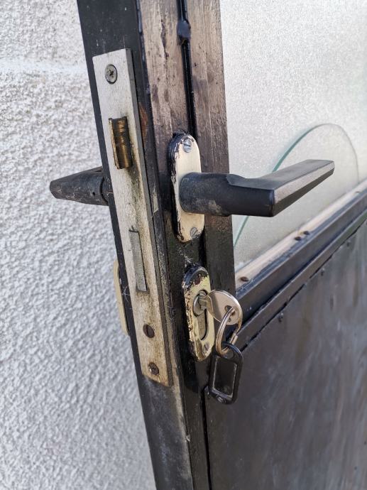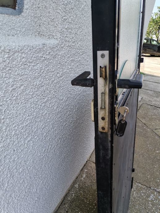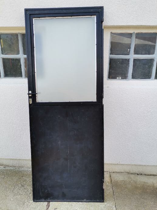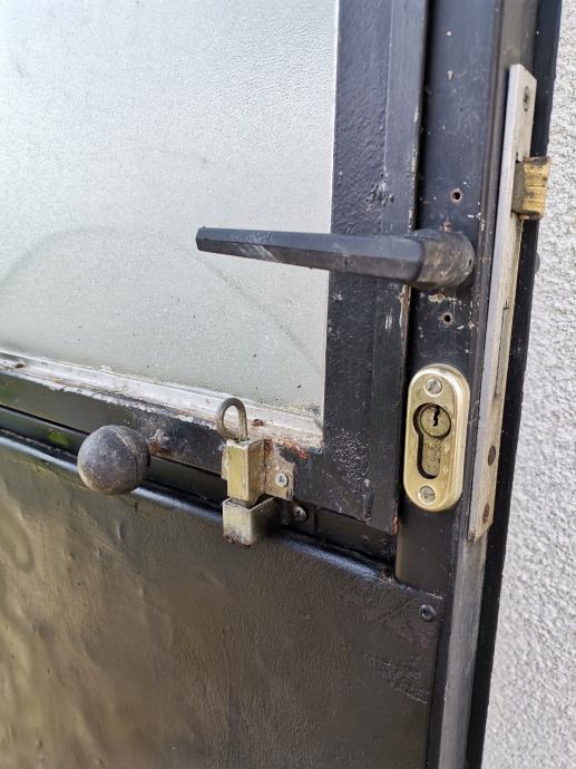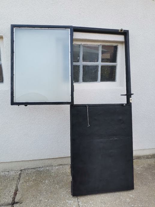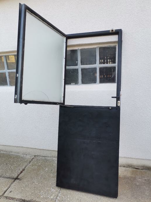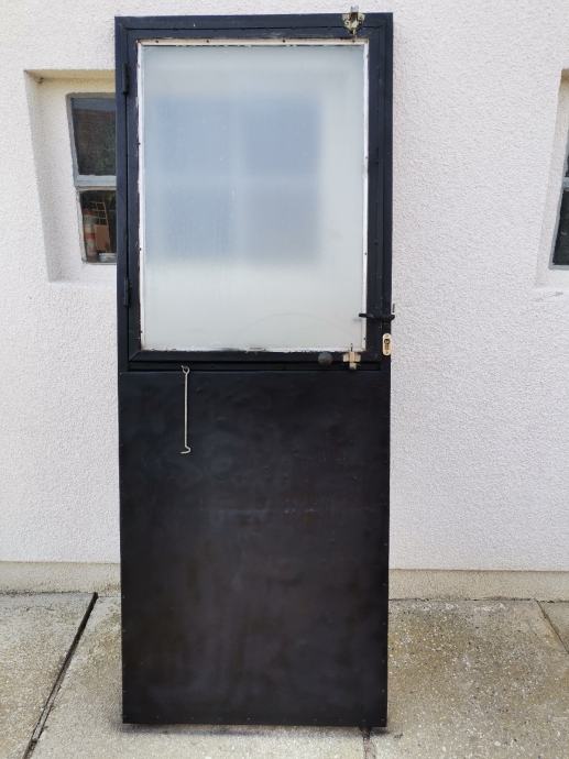 Dimenzije okvira vrata: pravokutna metalna cijev 50 mm x 40 mm. U donjem dijelu vrata ugrađen je stiropor debljine 5 cm za toplinsku izolaciju. U gornjem dijelu vrata ugrađen je prozor, dim: 95 x 72 cm na otvaranje sa ornament duplim rebrastim staklima debljine 4 mm. Prozor je fiksiran sa 2 opružna zasuna. Vrata su zaštićena temeljnom i zaštitnom lak bojom.
