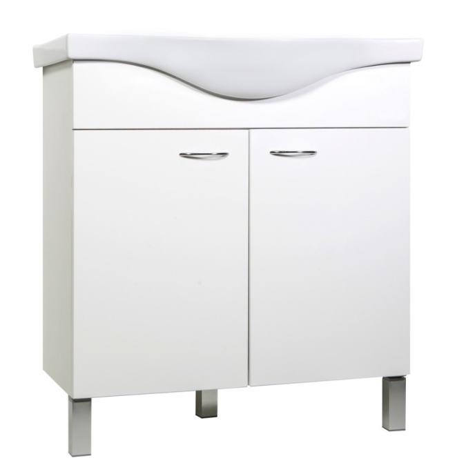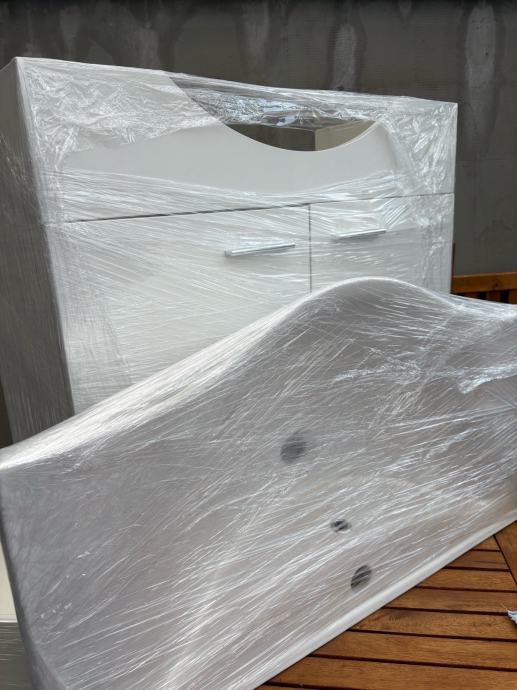 Novi kupaonski ormarić, ne korišten. Vidi se na jednoj slici da je umivaonik malo “napuknut” sto je rezultat pečenja keramike ali ne smeta ništa kod postavljanja. S vanjske strane se ne vidi te nije problem kod postavljanja ili korištenja.