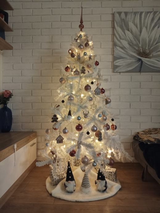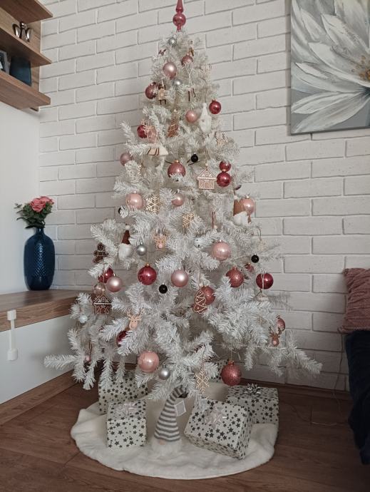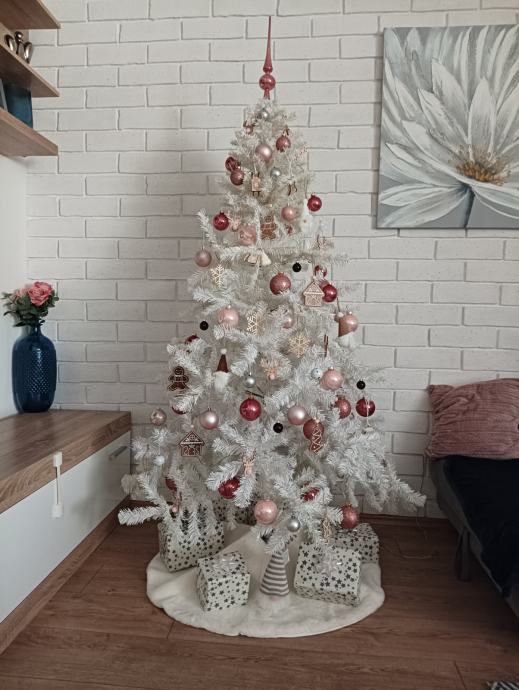 Bijeli umjetni bor visok 180 cm s metalnim postoljem. Bor je očuvan, kao nov. Prodaje se bez ukrasa. Molim zvati ili SMS na 0917996399.