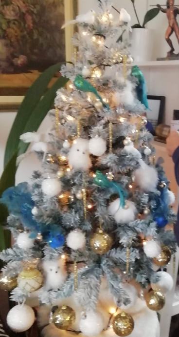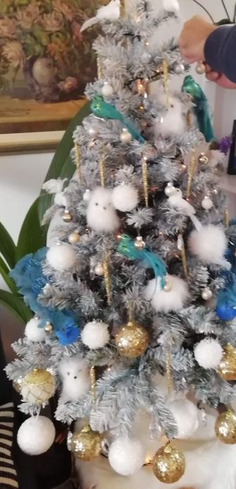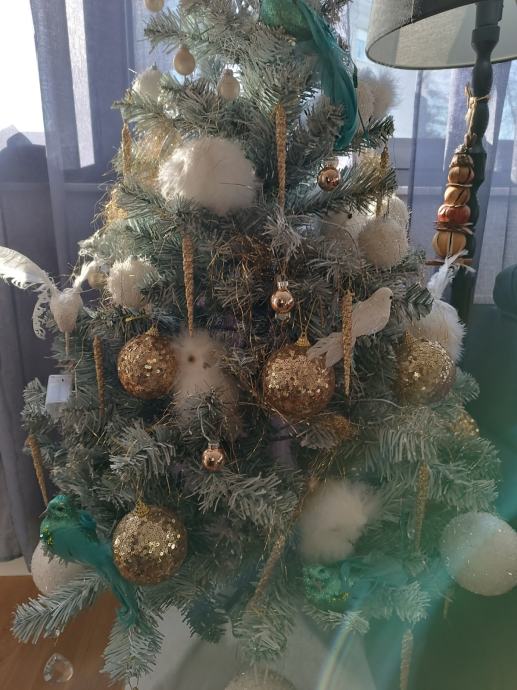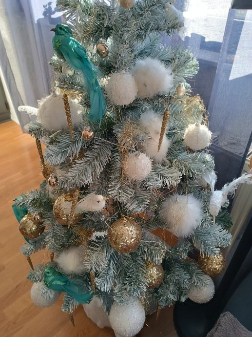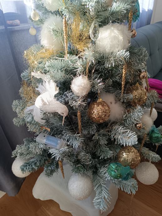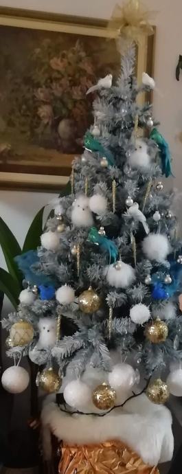 prodajem umjetni zeleno-bijeli bor, visine 120 cm sa svim ukrasima. sa stalkom.