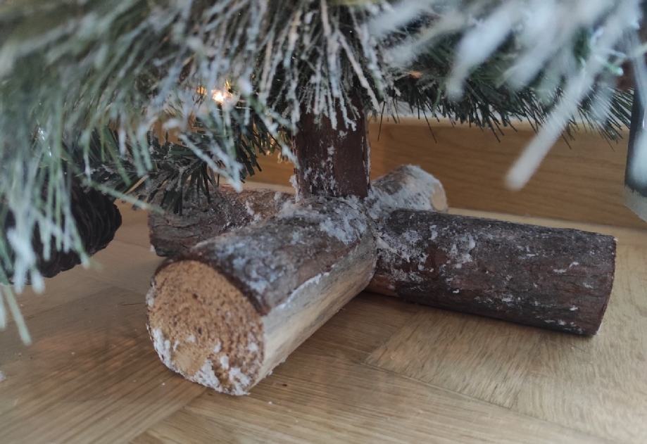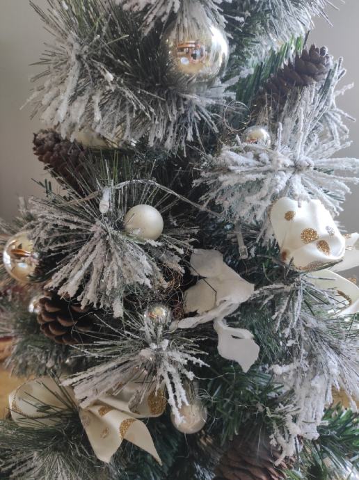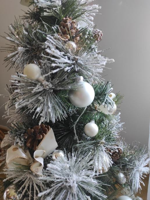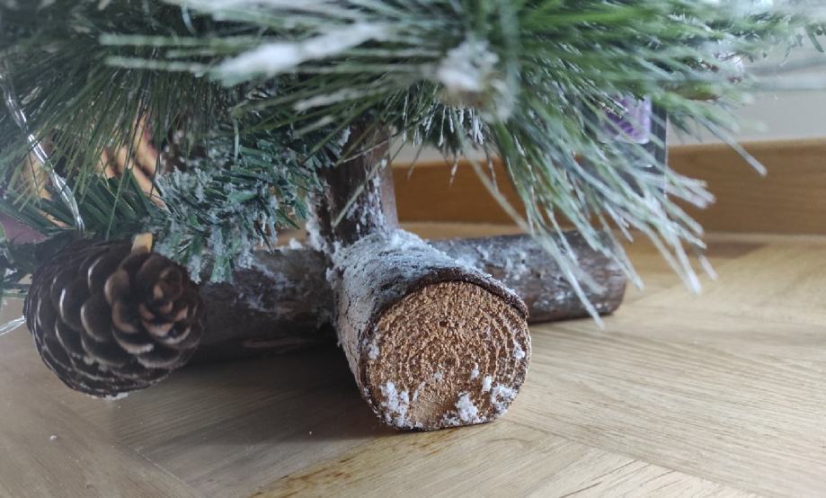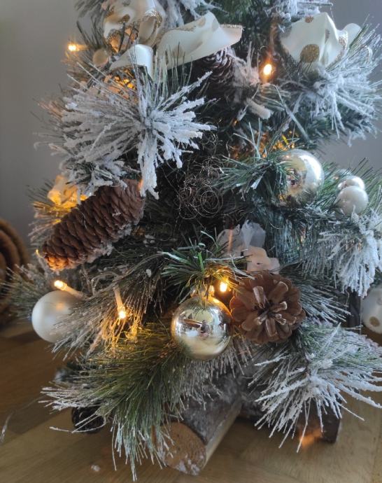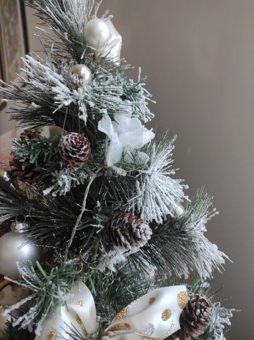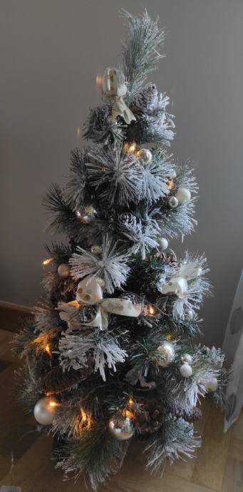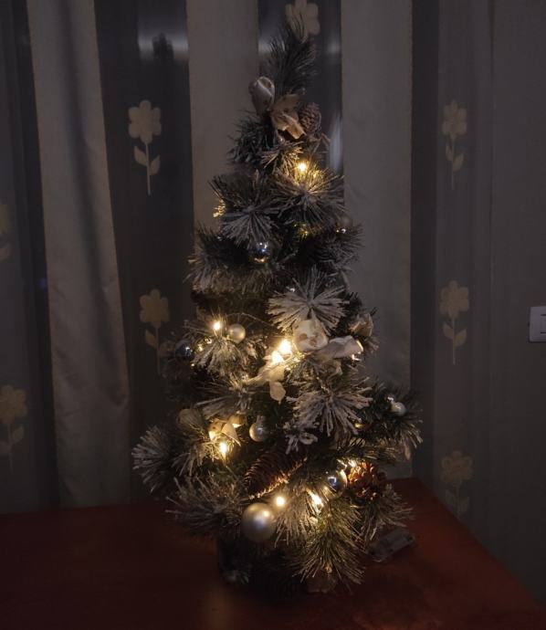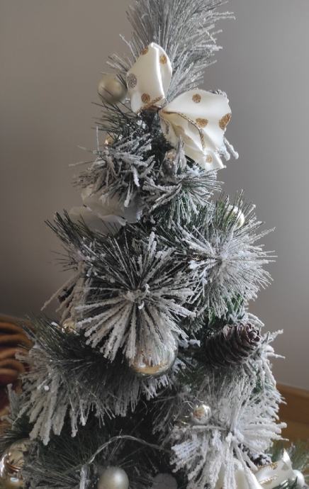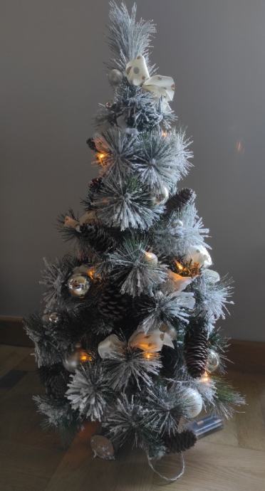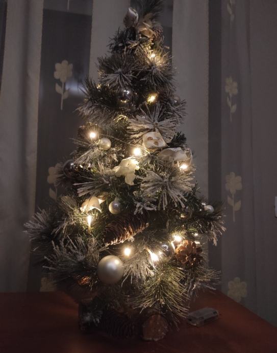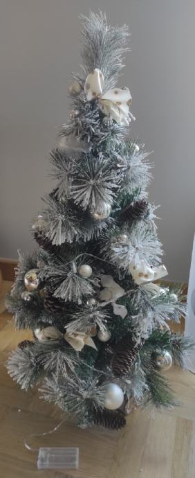 Novo božićno ukrasno umjetno drvce sa lampicama, visine 80 cm, promjera 40 cm. Ukrašeno božićnim ukrasima, na čvrstom stabilnom drvenom stalku. Potpuno ispravno, ne korišteno. Spremljeno sa mirisom.