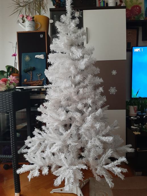 Bijeli bor, visine 150 cm, korišten samo jednom i čuvan u kutiji. U kompletu dolazi i bijeli stalak za bor.