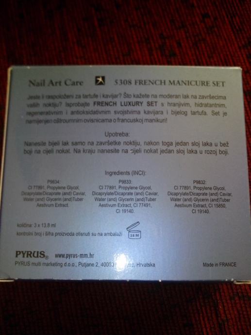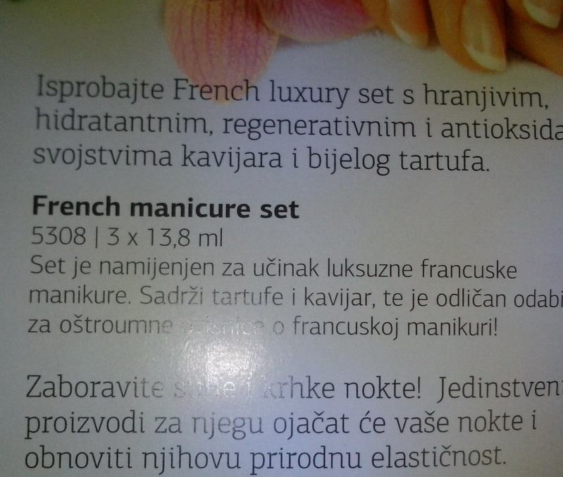 Set se sastoji od tri laka. Namjenjen je za učinak luksuzne francuske manikure.