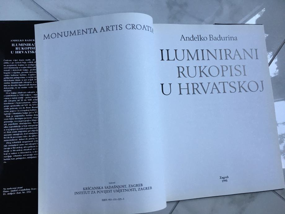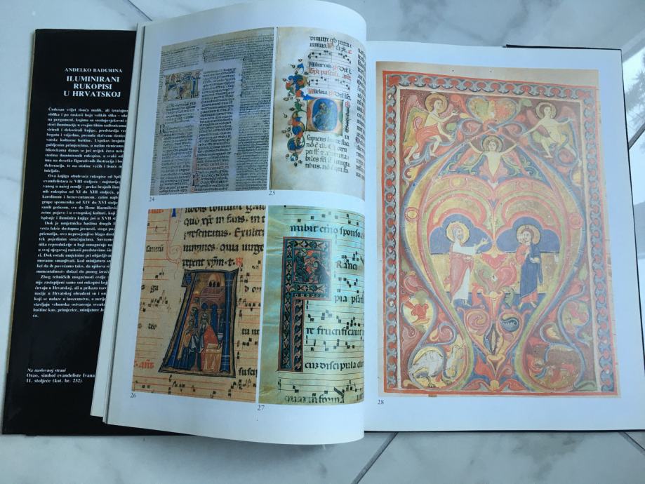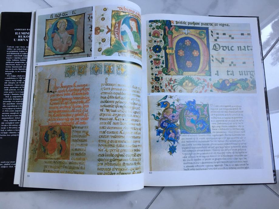 Danas se u Hrvatskoj čuva oko tri stotine što skromnije što raskošnije iluminiranih rukopisa nastalih između 11. i 16. stoljeća. Neki su od njih sačuvani cjeloviti, dok su drugi, osobito oni stariji, stigli do nas tek u fragmentima. Većina tih rukopisa potječe iz drugih kulturnih sredina, dok je glavnina onih nastalih u samoj Hrvatskoj s vremenom propala ili se danas nalazi u inozemnim knjižnicama i zbirkama. A među njima su upravo oni vrhunske kvalitete. Vrlo stari rukopisi (9.–13. stoljeće) pretežno su crkvene liturgijske knjige, dok među onim nešto mlađima (13.–16. stoljeće) osim liturgijskih, ima i knjiga pravničkog sadržaja, poučnih tekstova i priručnika pa i literarnih djela. (Anđelko Badurina, iz Uvoda)