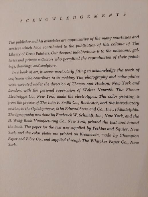 Tiskano i uvezano 1951. u Sjedinjenim Državama od strane W. Wolff Book Manufacturing Co, New York, ploče u boji izrađene pod vodstvom Thames & Hudson London, New York, litografski tisak u boji John P. Smith Co., Rochester.