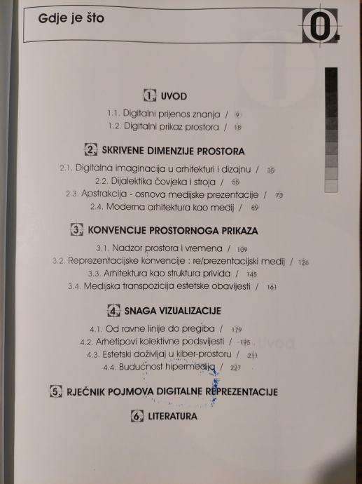 Knjiga hrvatske arhitektice u kojoj se u četiri poglavlja - Uvod, Skrivene dimenzije prostora, Konvencije prostornoga prikaza i Snaga vizualizacije - razmatra značenje digitalne reprezentacije prostora s nekoliko različitih diskursa. Također, na osnovu primjera iz arhitektonske prakse, objašnjeni su doprinosi "digitalne imaginacije" formiranju društveno-kulturnih identiteta od moderne do postmoderne i globalnih pokreta, kao i utjecaj digitalne tehnologije na odvijanje dizajnerske prakse. Na kraju knjige je rječnik pojmova digitalne reprezentacije i popis literature.