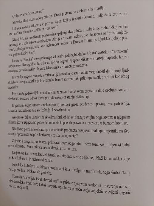 Ova luksuzno opremljena mongrafija na gotovo tristotinjak vrlo kvalitetno otisnutih stranica iako usredotočena na jedan element stvaralaštva autora, istovremeno vrlo dobro predstavlja ukupnost likovnih stremljenja Jure Labaša (r. 1935.). … Ako pristanemo uz mišljenje da je erotizam pobuna protiv pravila i rušenje zabrana, onda je on, istodobno, i anticivilizacijski akt. Koliko je ova misao zaprepašćujuća, toliko nije daleko od istine koja je široko prihvaćena u našem vremenu. Slikarstvo Jure Labaša, ne iscrpljuje svoje značenje u erotizmu. Niti ova kolekcija, iako je naslovljena "Erotika", ne tematizira samo spolnost. Možda bi imenovanje ovog ciklusa "Mehanički eros" bilo najprimjerenije ikonografiji i intenciji kojom je umjetnik bio zaokupljen. Znamo što je kozmogonicki eros značio u Hesioda i u orfičkim teogonijama, a što u Platonovoj filozofiji: stvaralački princip ili nagon za spoznajom ideja. Kod Jure Labaša Eros nije stvaralačko božanstvo. Prije bi se moglo kazati da je njegovo uprizorenje Erosa izvrnuta slika Thanatosa. U Labaševim djelima iz kolekcije mehaničke erotike smrt je blisko nazočna: tijelo se dijeli i napokon raspada poput mehaničke lutke. Pojam "mehanika" zasigurno ima u Labaševoj imaginaciji posebnu važnost; on je povezan, naravno, sa strojem koji umjetnik personificira u pojedinim aktovima. Stroj se u nekim crtežima stapa s ljudskim tijelom: ne zna se ponekad gdje prestaje organsko, a počinje mehaničko. Uvodeći mehanički pokret, Labaš je akt podredio opasnom i besciljnom kretanju u kojem tijelo više ne uspijeva naći ni zadovoljstvo ni spokojstvo. Ovo mnoštvo elemenata strojeva, ovo kovitlanje motociklističkih kaciga, kabela, štitnika, gibnjeva, cilindara i odbojnika simbolički je izraz deprivacije Erosa… (V. Maleković)