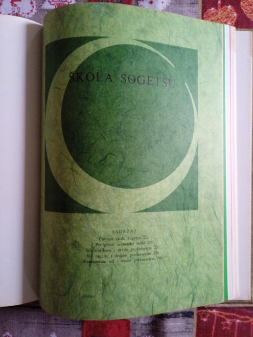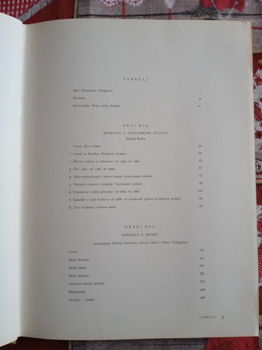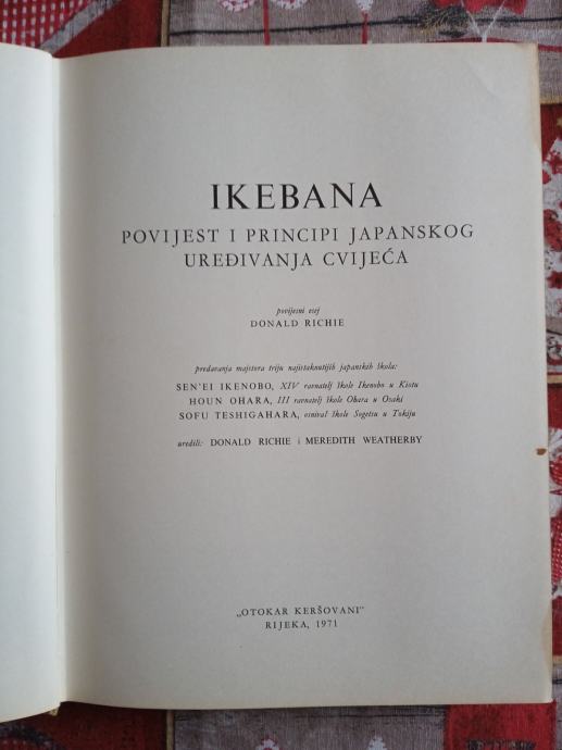 Povijest i principi japanskog uređivanja cvijeća. Povijesni esej Donald Richie. Predavanja majstora triju najistaknutijih japanskih škola: Senei Ikenobo, XIV ravnatelj škole Ikenobo u Kiotu. Houn Ohara, III ravnatelj škole Ohara u Osaki. Sofu Teshigahara, osnivač škole Sogetsu u Tokiju.