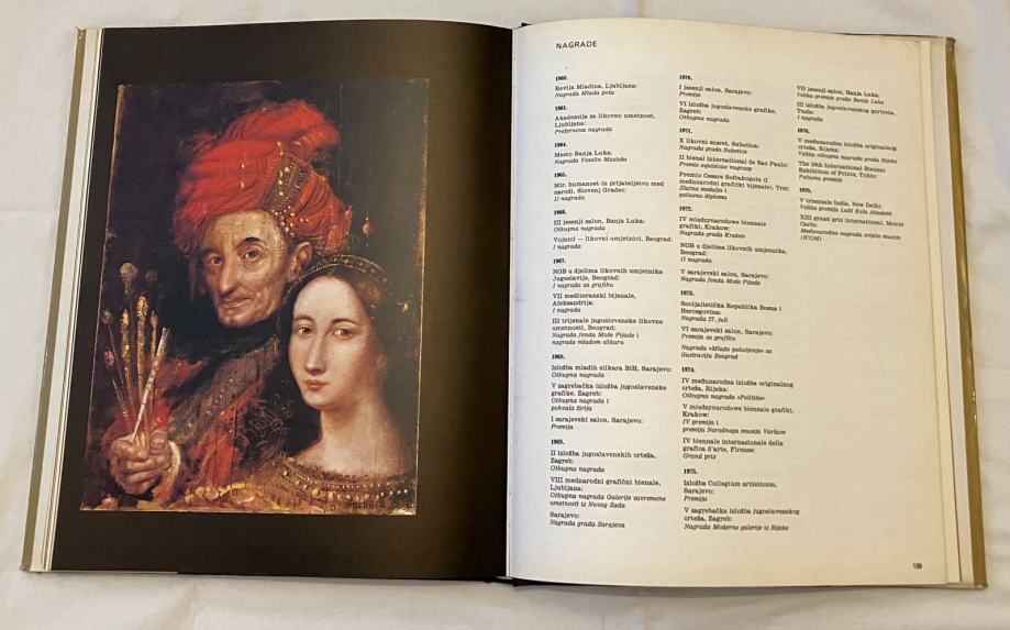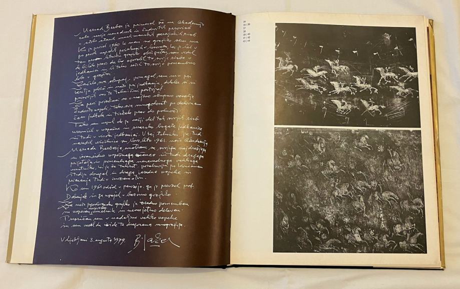 Crno-bijele i reprodukcije u boji: crteži, grafike, drvorezi, sitotisci, ulja. Autori u tekstu: Mak Dizdar, Ivo Andrić, Luc Menaše, Božidar Jakac, Meša Selimović, Muhamed Karamehmedović, Tatjana Pregl, Jože Brumen, Iztok Bartolj, Egon Kaše