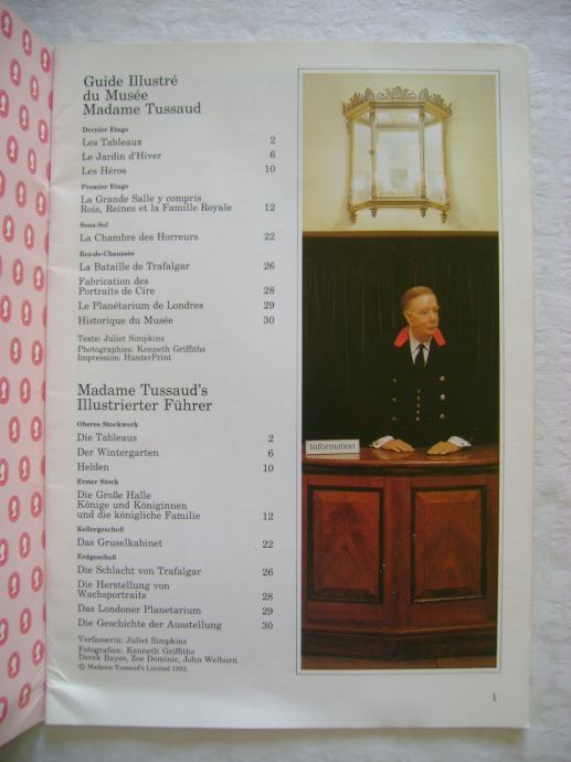 Muzej Madame Tussaud's - ilustrirani vodič na francuskom i njemačkom jeziku iz 1982. godine, 21 x 30 cm, meki uvez, 32 stranice, bogato ilustrirano.