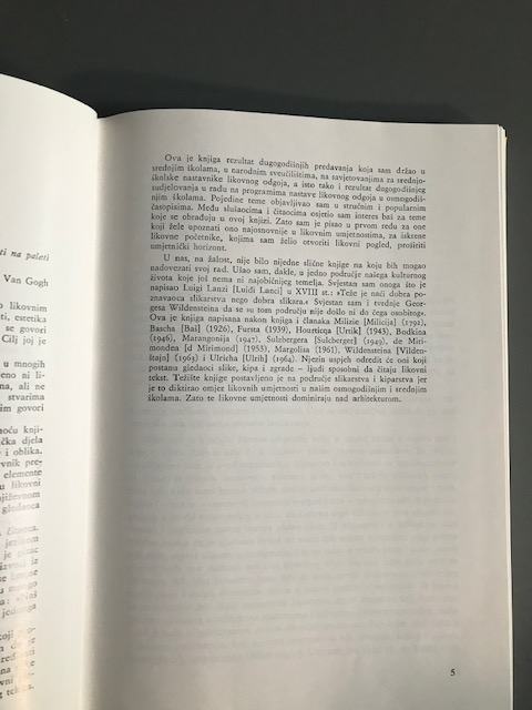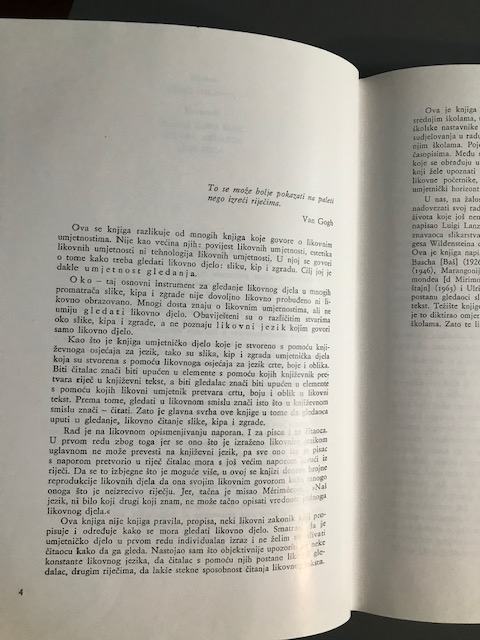 Jedan od najvećih napora prilikom gledanja slika i kipova sastoji se u tome da se apstrahira ono nelikovno – motiv, a preda se riječ samo njegovim likovnim destilatima- crti, boji, volumenu. Knjiga savjetuje čitatelju kako bolje “gledati” u likovno djelo, i kako ga točnije protumačiti.(iz tiska)