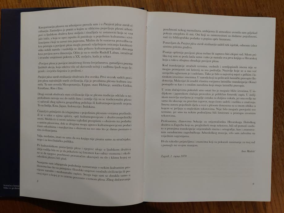 Prvi dio knjige Povijest plesa starih civilizacija posvećen je izučavanju plesa u Mezopotamiji, starom Egiptu, Grčkoj i Rimu, te plesu Hebreja, Etrušćana i Ilira. Rukopis ove knjige autorica je dovršila sada već davne 1979. godine, ali je on sve do sada bio samo dijelom njezine bogate i vrijedne ostavštine pohranjene u Hrvatskome državnom arhivu. Objavljivanje ovoga jednostavno i popularno pisana rukopisa stoga je pravi kulturološki događaj budući da se knjige s tematikom plesne umjetnosti gotovo uopće ne objavljuju u Hrvatskoj.
