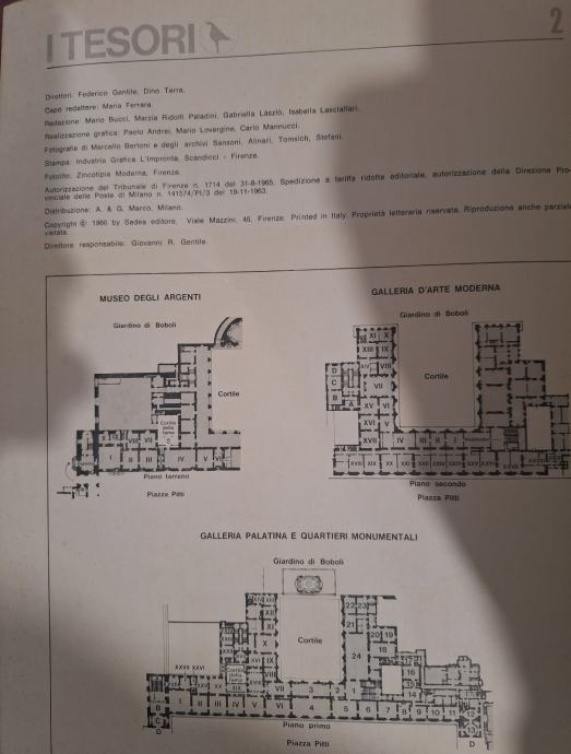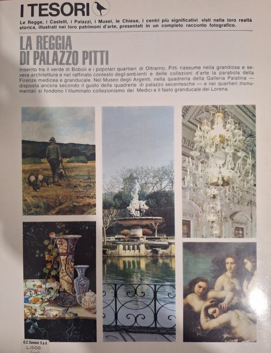 I tesori: La reggia di Palazzo Pitti (Blaga: Kraljevska palača Pitti). Knjiga, objavljena 1966. godine, dio je serije "I tesori" (Blaga) izdavača Sadea/Sansoni Editori. Urednici ili autori su Ugo Procacci i Anna Maria Francini Ciaranfi.