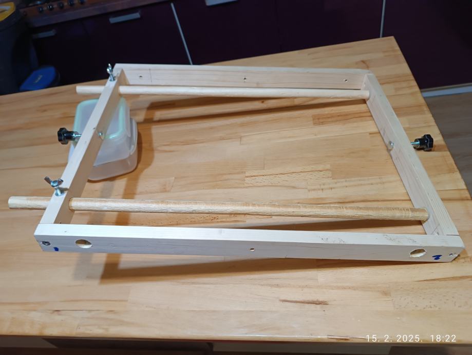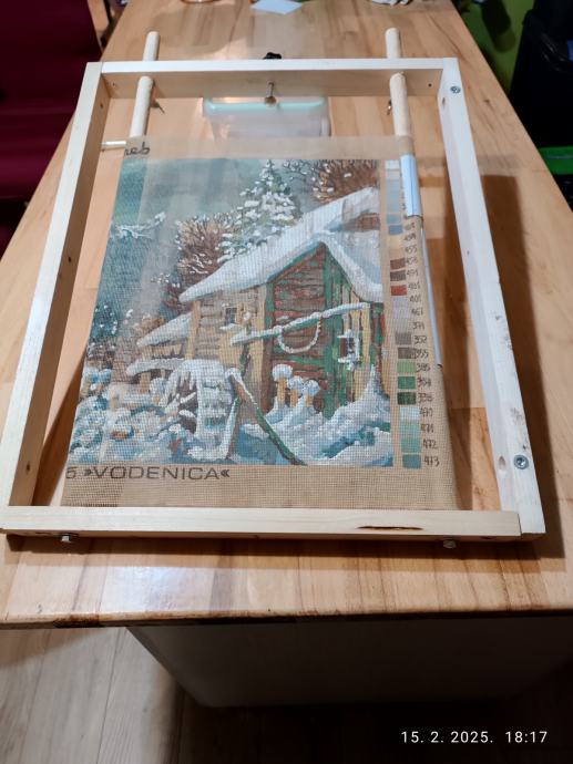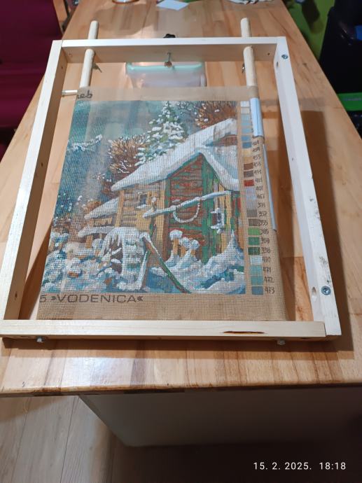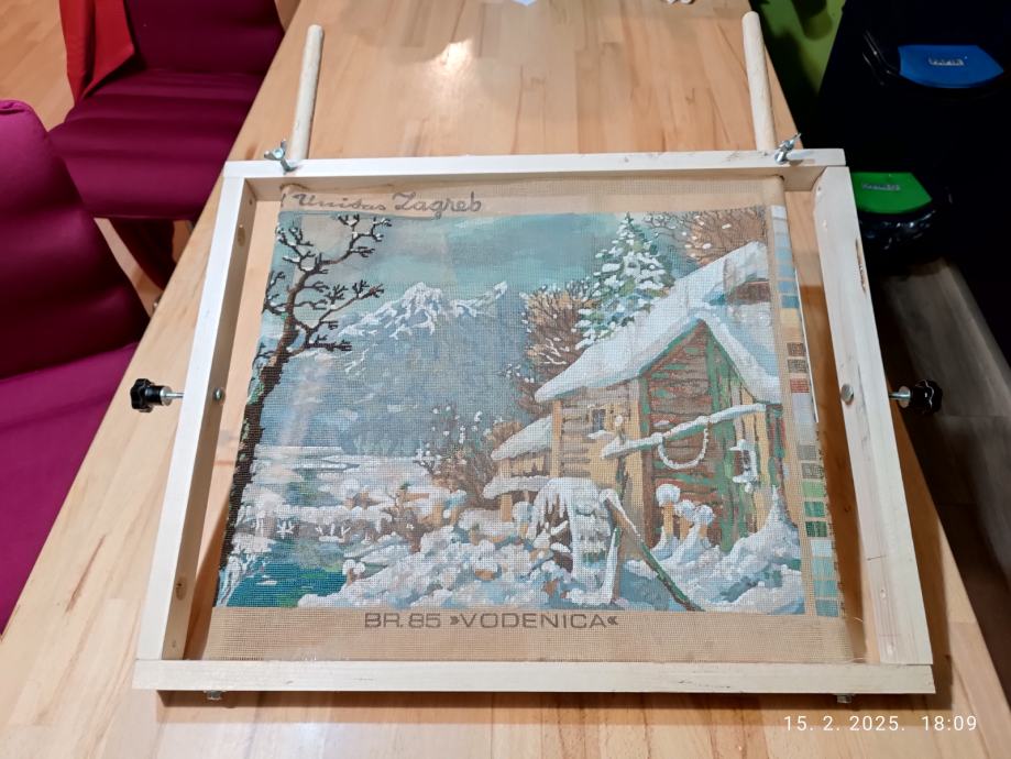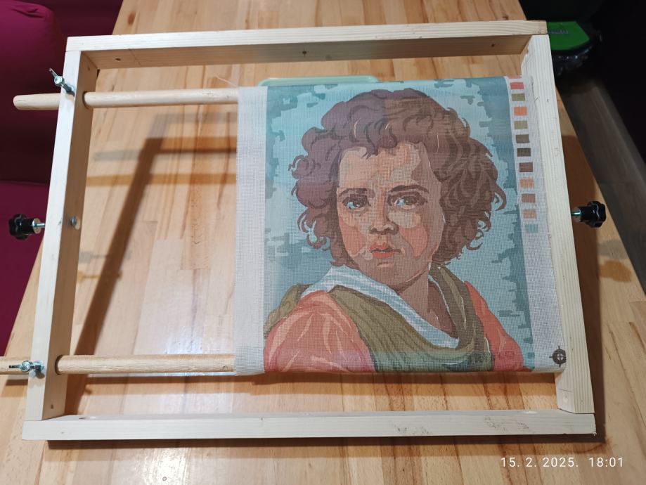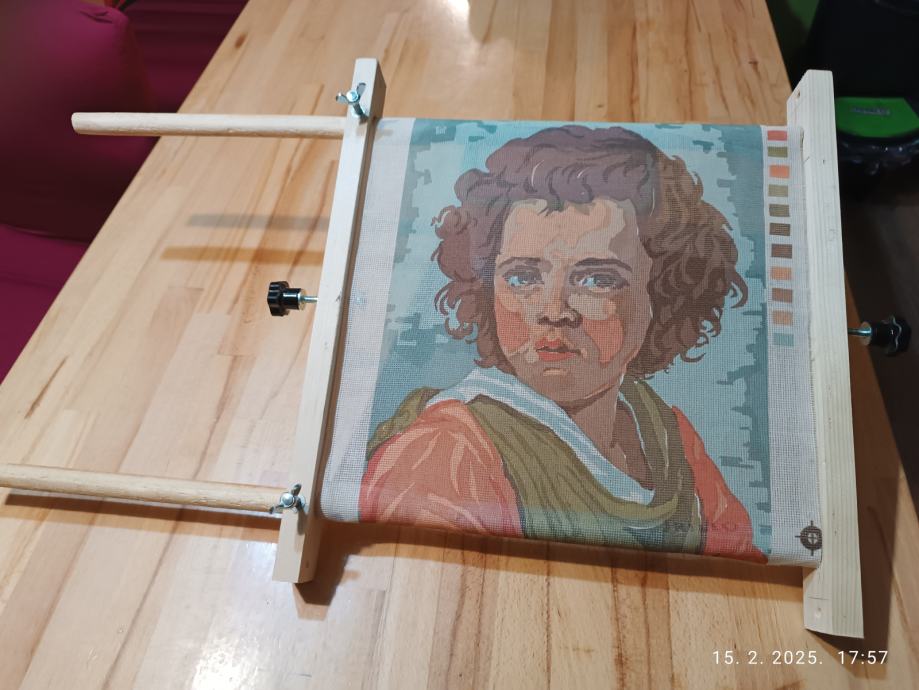 Okvir ima plastične cijevi za pričvršćivanje platna (goblena) bez čavliča (pogledaj video).