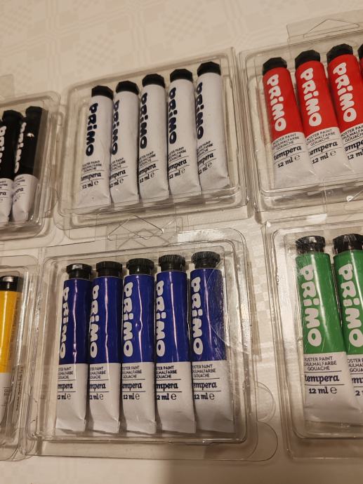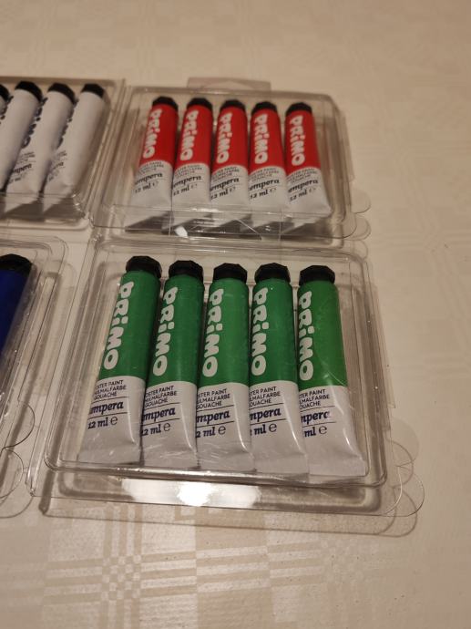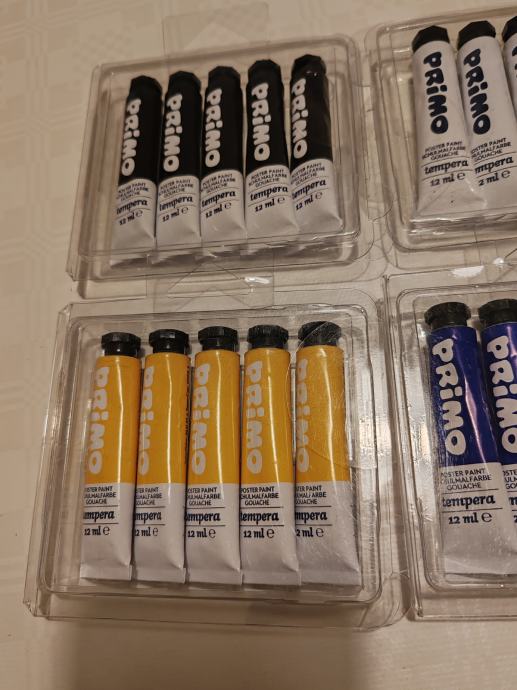Primo: Setovi od po 5 tempera u aluminijskoj tubi, zapremine 12 ml svaka. Pakirane u PVC kutiji.