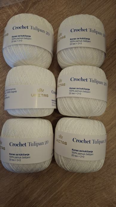 Dostupno 6 klupka konca za heklanje Tulipan 20 u bijeloj boji, original Unitas.