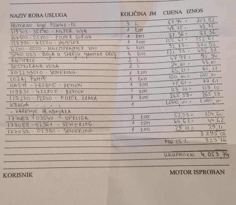 Yanmar 21 konj sa 3 cilindra. Vozen cca 250h, repariran. Uz njega ide osovina, propela, ručka gasa sa sajlama, auspuh i rezervar od 40l kapaciteta. Motor se prodaje isključivo u kompletu!