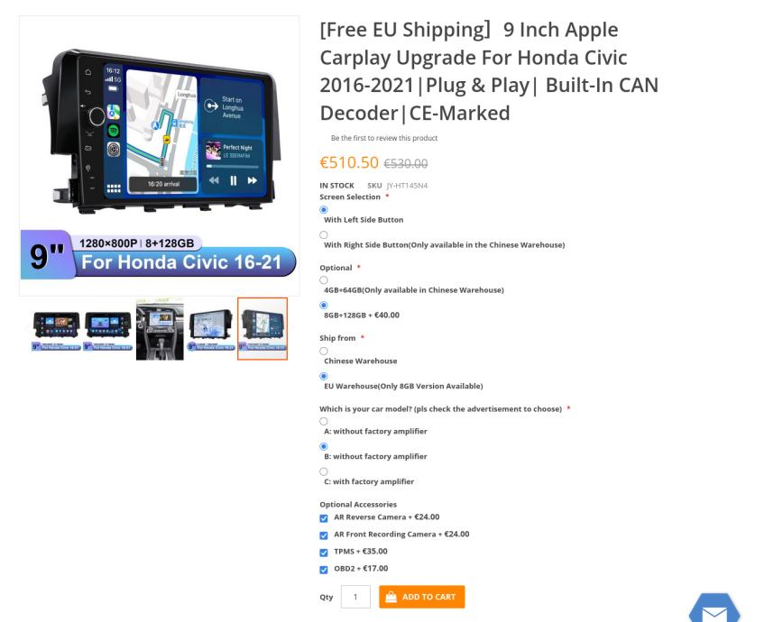 9 Inch Apple Carplay/Wireless Android Auto Upgrade za Hondu Civic 2016-2021