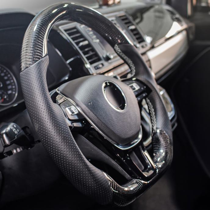 Dajte svom VW T6 (model godina 2015-2019) sportsku nadogradnju s našim ekskluzivnim sportskim upravljačem! Ovaj elegantni upravljač kombinira pravog karbona elemente s perforiranom kožom i završen je elegantnim bijelim šavovima. Pravi privlačan za svaki interijer vozila!