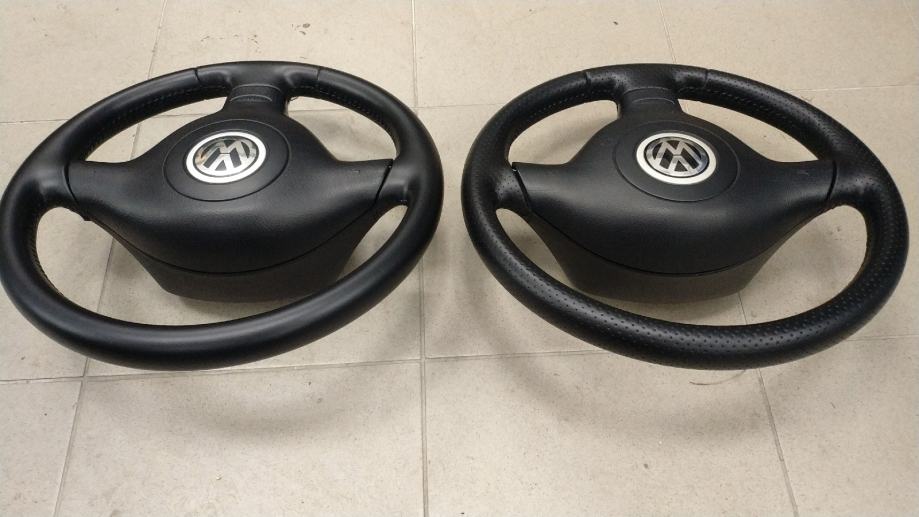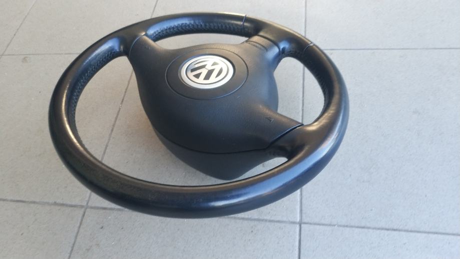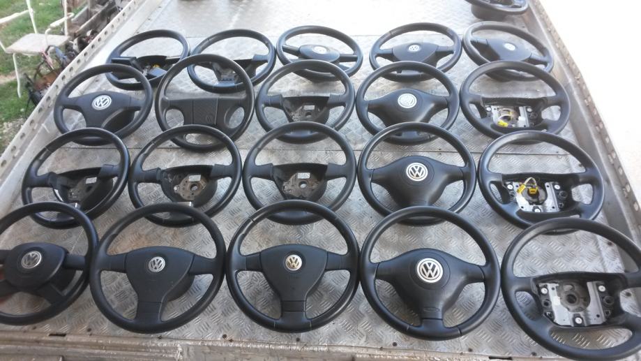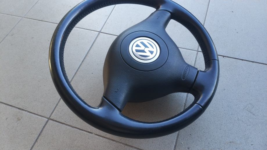 Volan za VW sa tri kraka , ima zračni jastuk. Odgovara za Golf 4 , Passat , Bora i druge. Cijene za komplet volan i air bag Golf 4 je 150 eura . Imaju i drugi volani za Passat , Caddy , Touran , Golf 4 , 5 i druge neki volani su gumeni , neki kožni , tri i četiri kraka .
