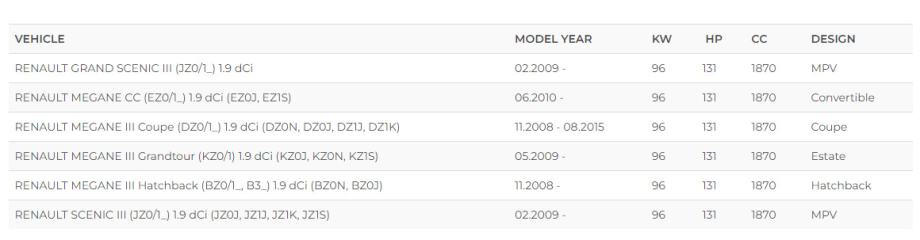 Odgovara na modele Renault Megana III 1,9 dCi motore i Scenica, zbog tocnosti podataka prilazem tablicu s odgovarajucim modelima auta na koje odgovara.