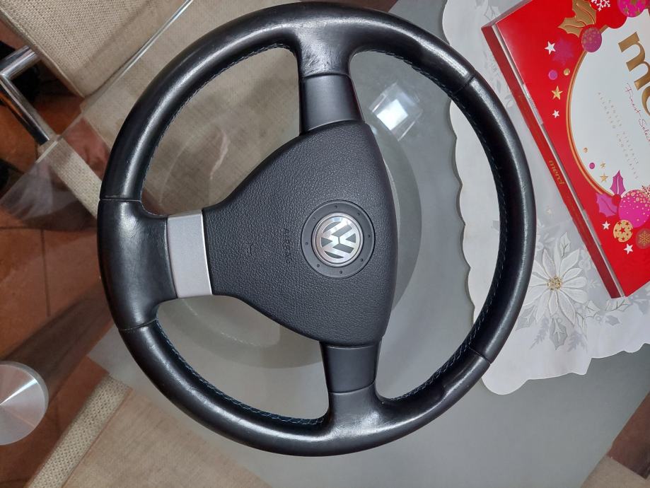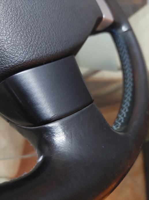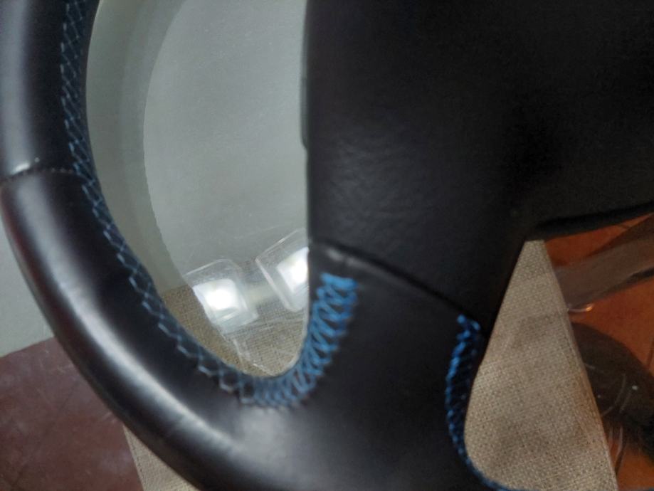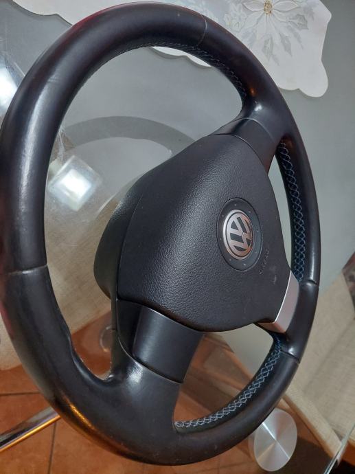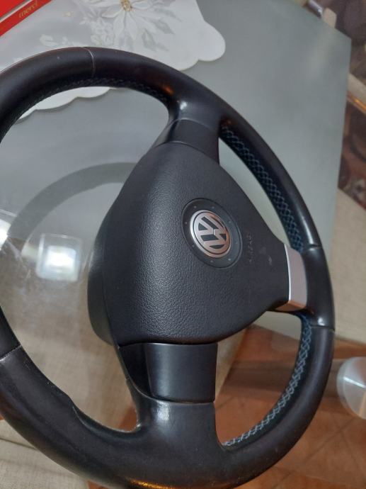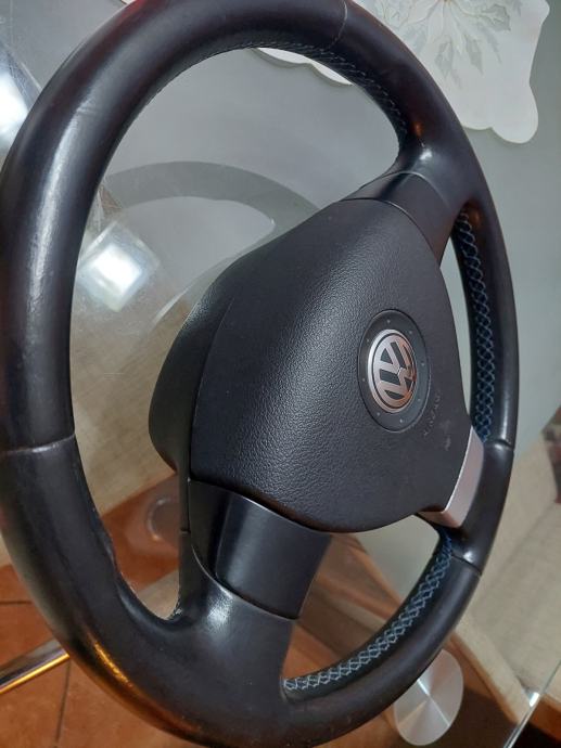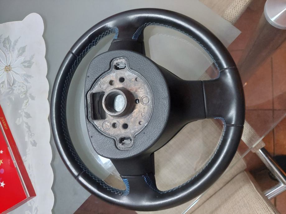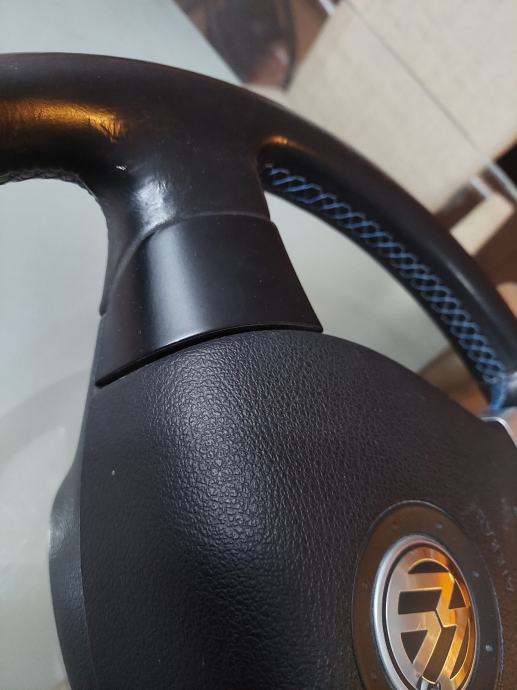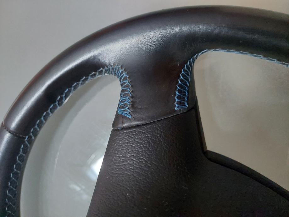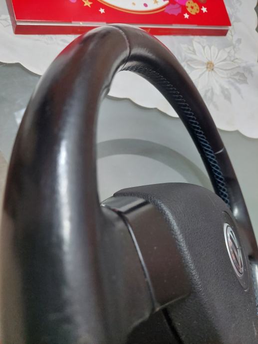 Kožni volan crni sa plavim koncem i srebrnim pločicom