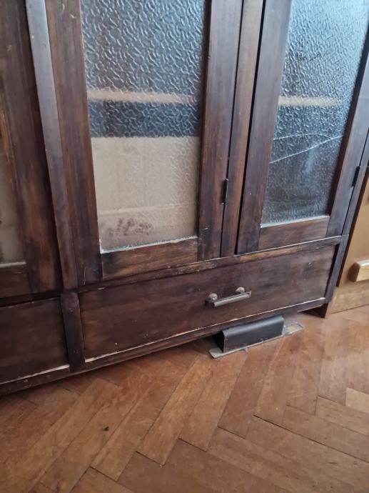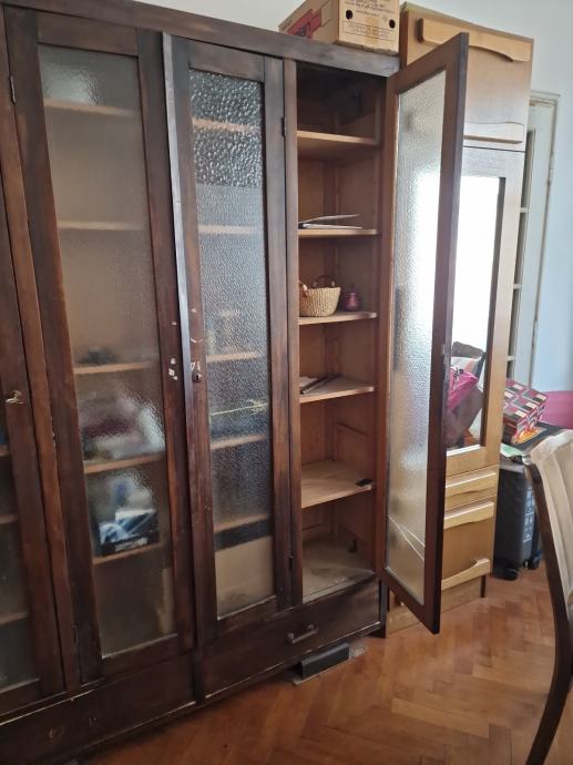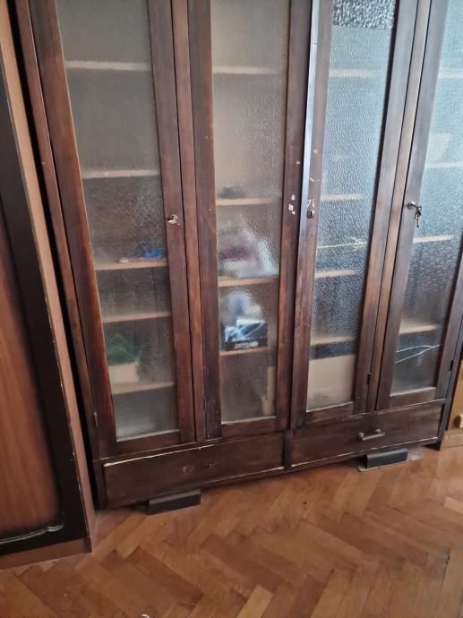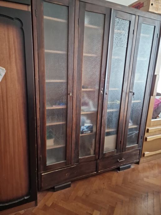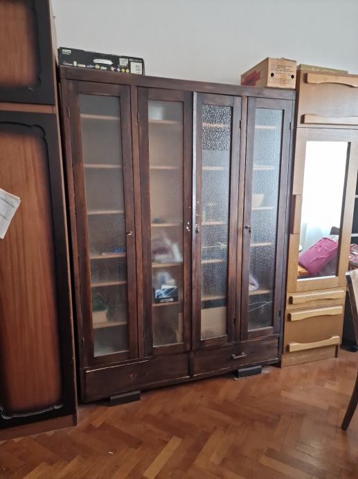 Biblioteka sa 4 staklena vrata, sa po 7 polica u 4 segmenta, puno drvo, sa bravicama, i vije ladice pri dnu ormara.
