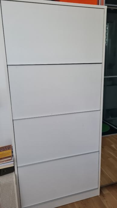 Očuvani bijeli ormar za ured, radnu sobu ( 2 polica je izvlačna polica i može poslužiti kao podloga za laptop). Prikladno i za dječju ili spavaću sobu ili dr. prostor. Praktično odlaganje stvari. Može biti zatvorena kao ormar ili otvorena kao regal,zbog polica koje se kližu prema unutra.