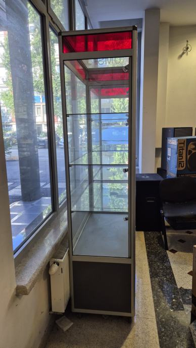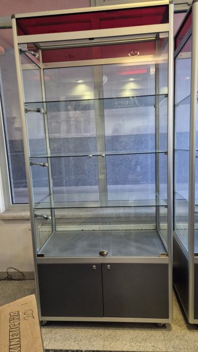 Prodaju se kvalitetni i očuvani stakleni ormari s bravama i ključevima, te integriranom rasvjetom. Ormar ima 3 staklene police, staklo sa sve 4 strane. Donji dio ormara je zatvoren s vratima i ima jednu policu. Ormar je idealan za kozmetičke salone, frizerske salone, trgovine, parfumerije, za potrebe izlaganja proizvoda. Proizvodi se mogu izložiti u ormaru i držati zaključani.