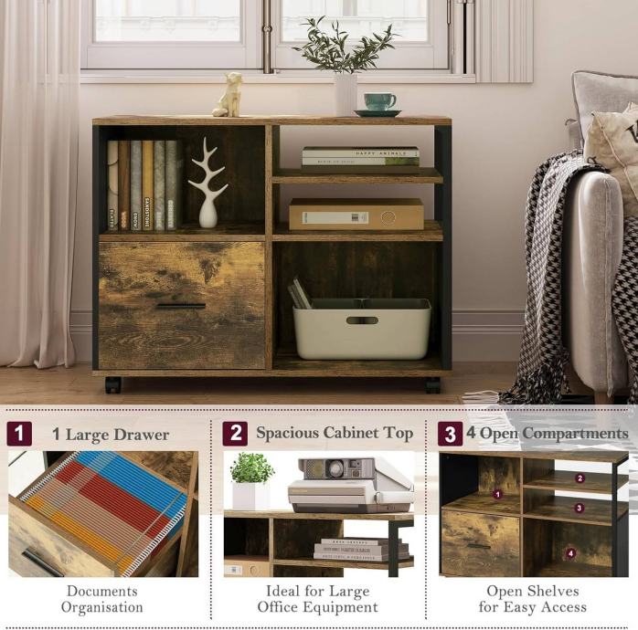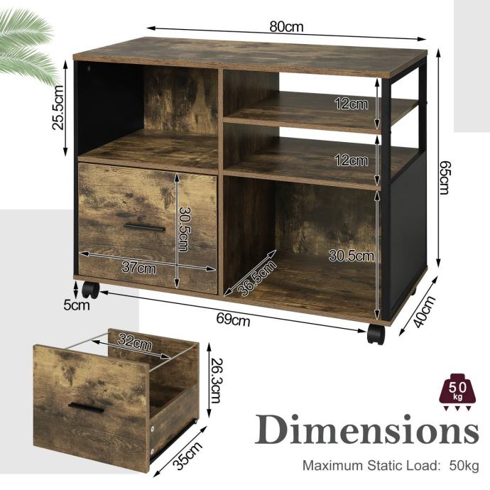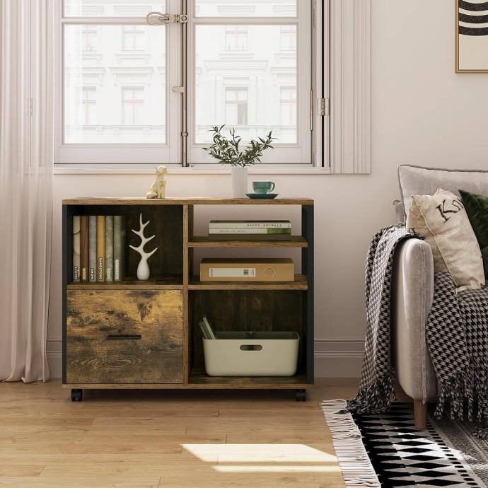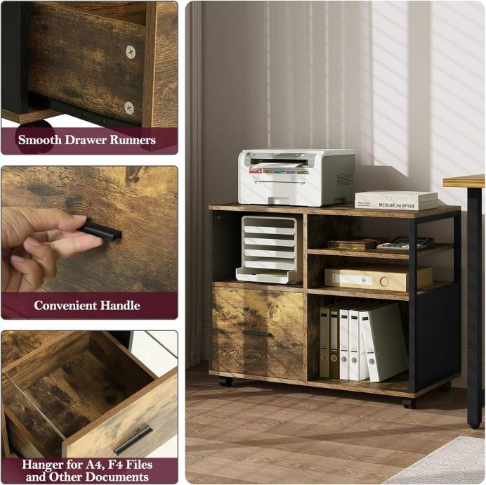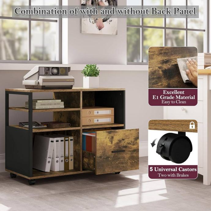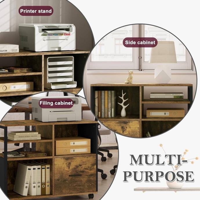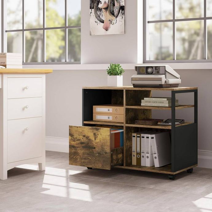 Stabilnost i mobilnost osiguravaju 5 kotača, od kojih su dva s kočnicom, pa ga možete lako premjestiti ili učvrstiti po potrebi. Vintage industrijski stil ormarića čini ga svestranim za upotrebu kao uredski ormarić, stalak za pisač, kuhinjski ili kupaonski ormarić te dodatni spremnik u dnevnom boravku.