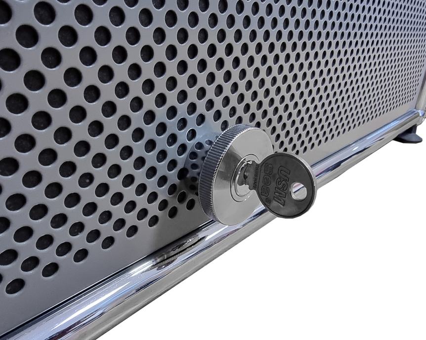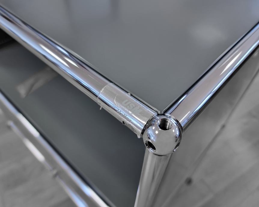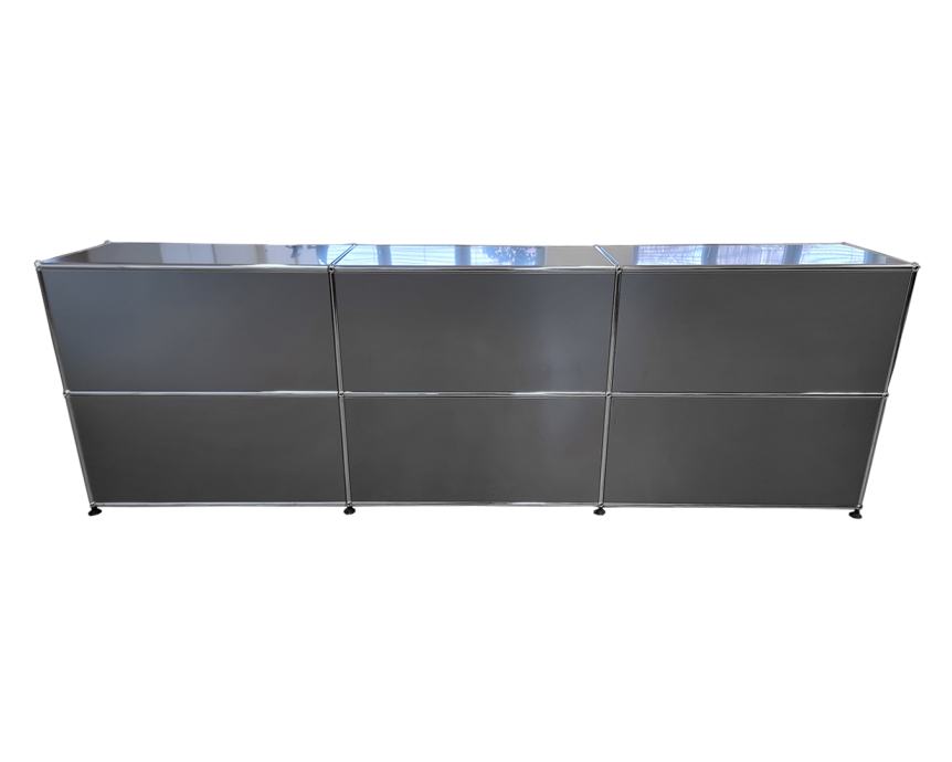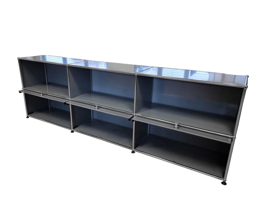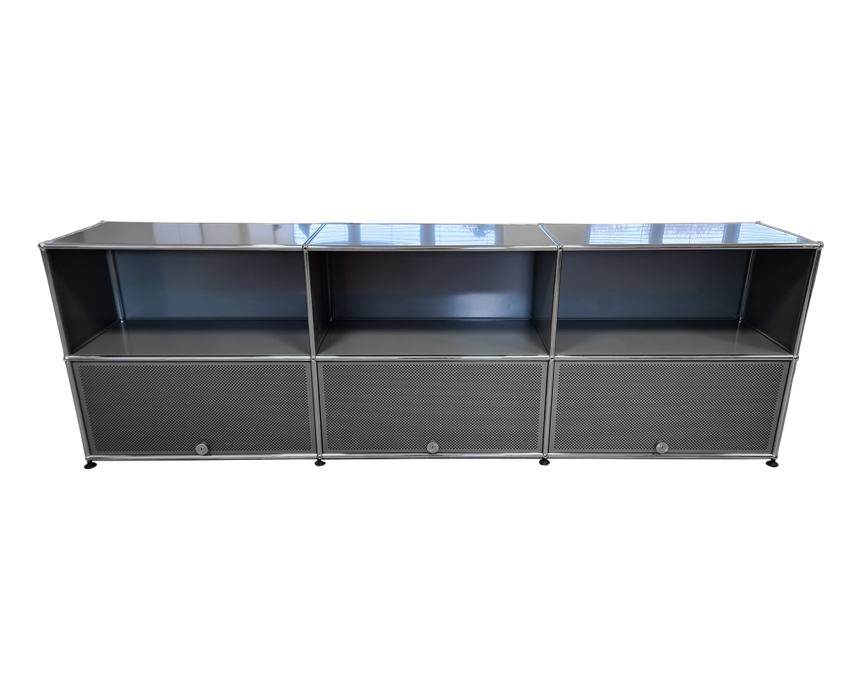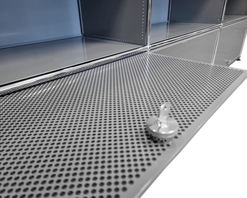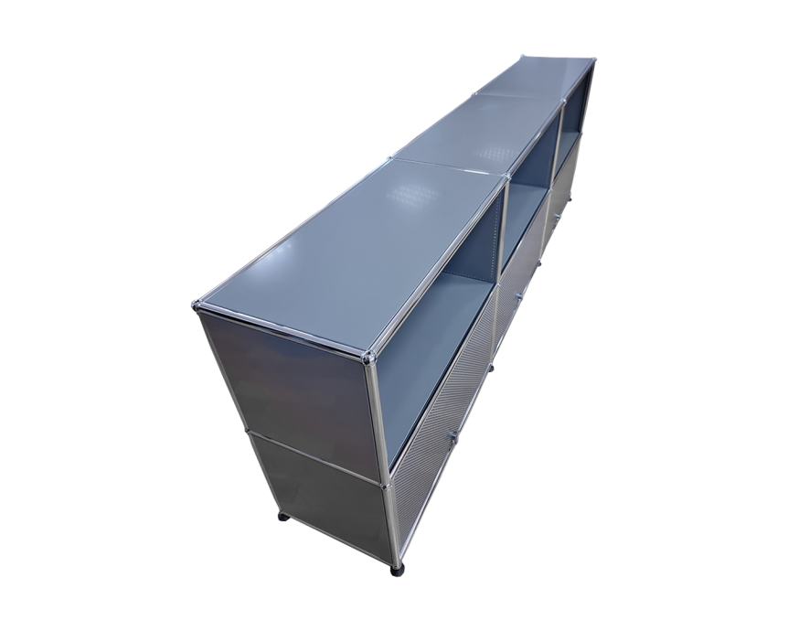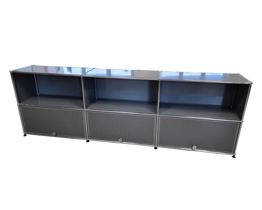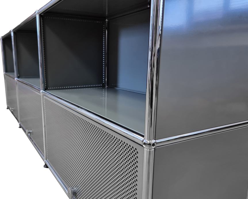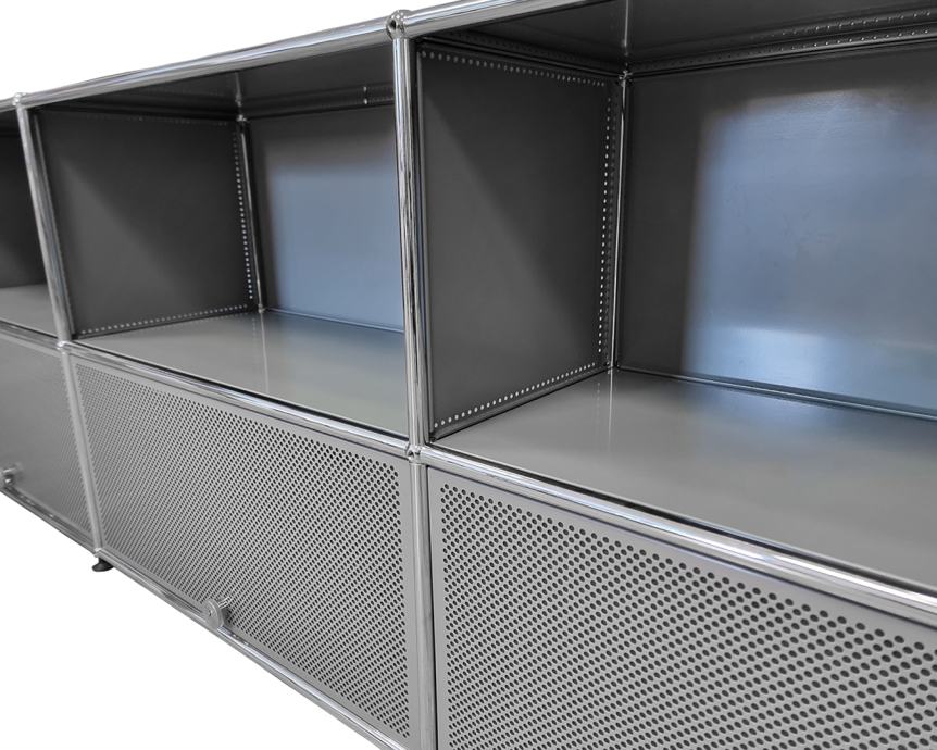 USM Haller komoda, srednje siva RAL 7005, komoda s perforiranim frontama, komoda za apsorpciju zvuka, metalna komoda, komoda s kromiranom strukturom, održavanje komode, MoMA stalna kolekcija, GREENGUARD certifikat, LEED Zelena direktiva, namještaj za dnevni boravak, uredski namještaj, moderni namještaj, funkcionalni namještaj, dizajnerski namještaj, kvalitetan namještaj.