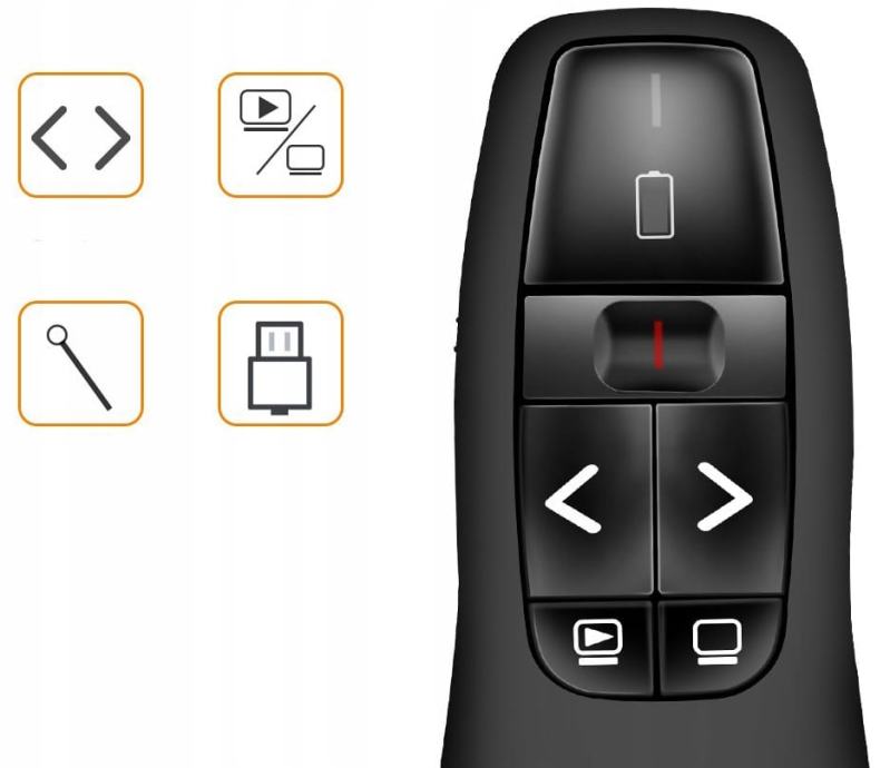 - Funkcije: Sljedeći slajd, prethodni dijapozitiv, start/pauza, ušteda zaslona (u nekim aplikacijama).