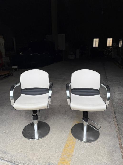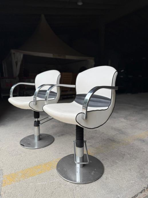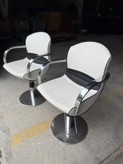 Frizerska stolica renomiranog branda Karisma Beauty s čeličnim okvirom i podstavom od ekspandiranog poliuretana, presvučena visokokvalitetnom umjetnom kožom (skai). Nasloni za ruke od lijevanog aluminija. Visoko sjajna kromirana završna obrada. Ispod sjedala je integrirana hidraulika sa blokadom kojom se sprječava okretanje cijele stolice oko svoje osi.