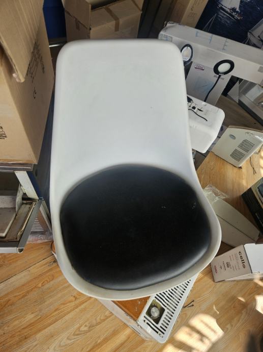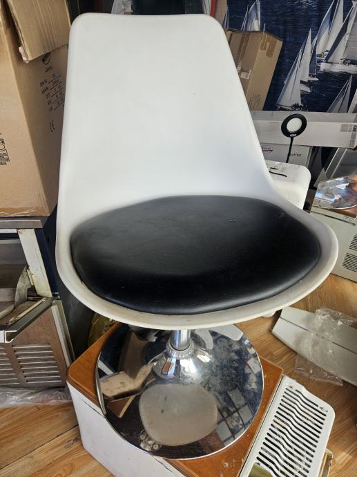 Bijela fotelja s uzorkom tulipana, crnim sjedalom i metalnim nogama, visina sjedala 41 cm, ukupna visina 80 cm, cijena 40 €, okretna
