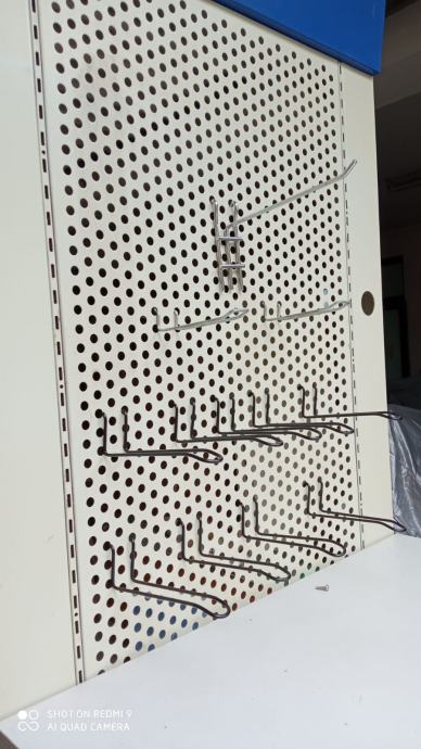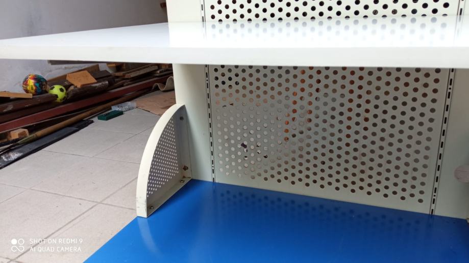 na policama ili na pojedinačnim metalnim nosačima kako je prikazano na slikama . Visina police 220 cm , dubina 62 cm , širina 70 cm. Imam 3 drvene police koje se mogu nivelirati i oko 30 pojedinačnih
