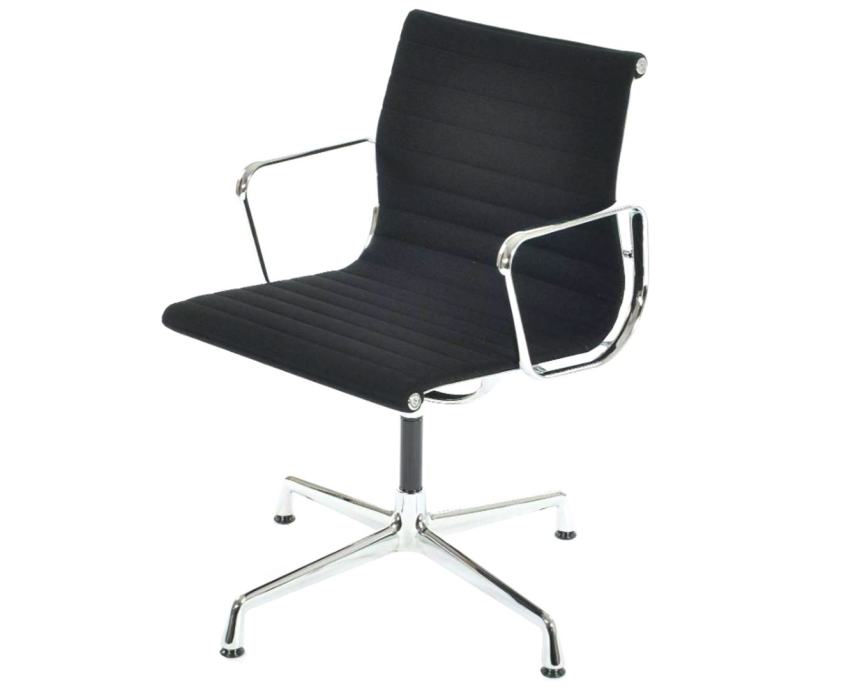 Charles Eames Aluminium Chair EA 107 ističe se bezvremenskim dizajnom i visokom udobnošću sjedenja. Stabilna kromirana konstrukcija i presvlaka od crne Hopsak tkanine čine je idealnom za sastanke ili kao profinjeni dodatak vašem radnom prostoru.