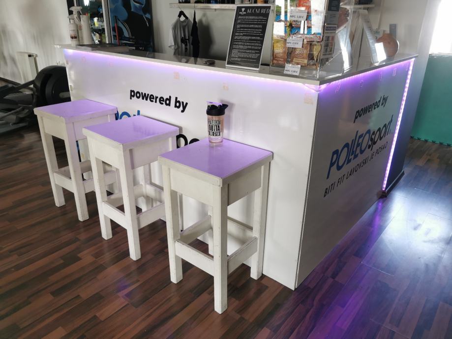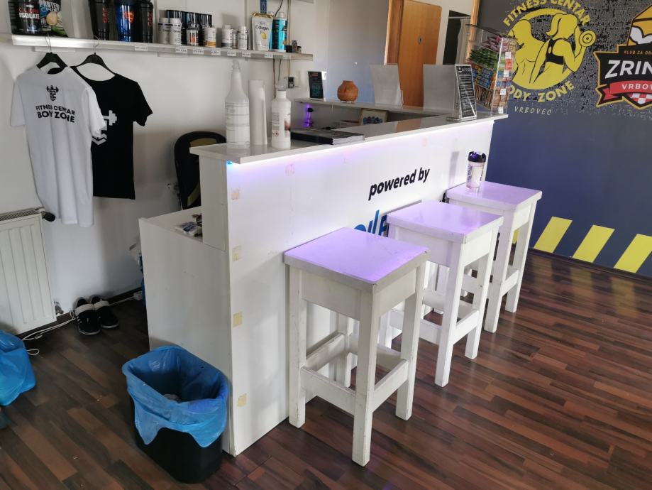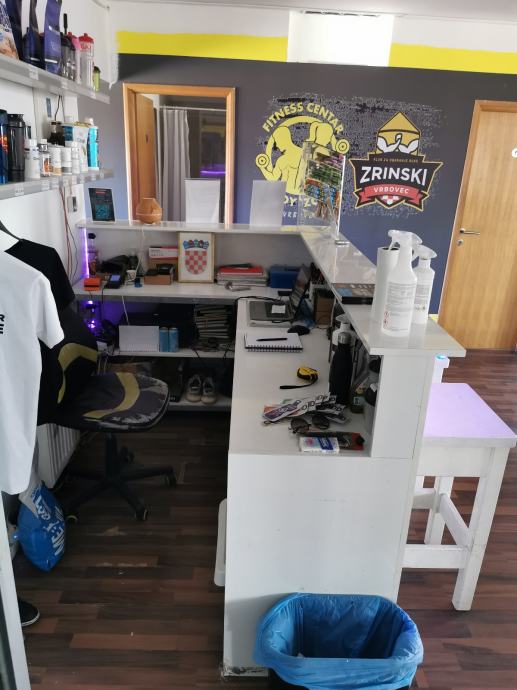 Recepcijski stol korišten u teretani. Potrebno ga je djelomično razmontirati kako bi se mogao iznijeti van i odvesti.