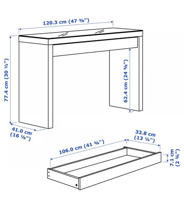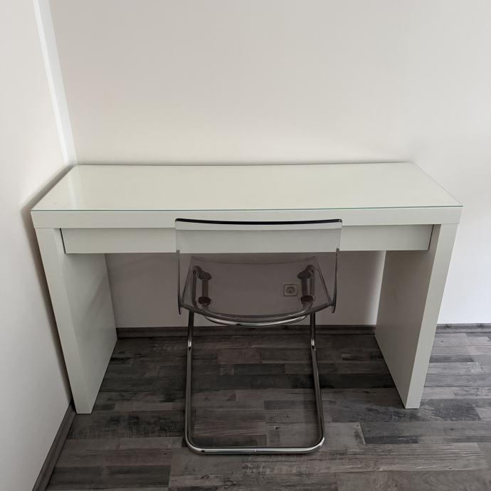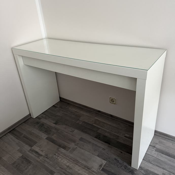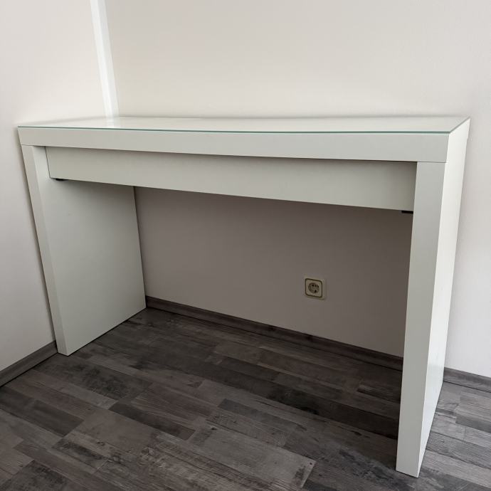 Prodajem toaletni stol Malm kupljen u Ikei. Stol je u odličnom stanju i potpuno očuvan. Bijele je boje te na gornjoj strani ima staklo. Ima jednu ladicu. Dimenzije prikazane na zadnjoj slici.