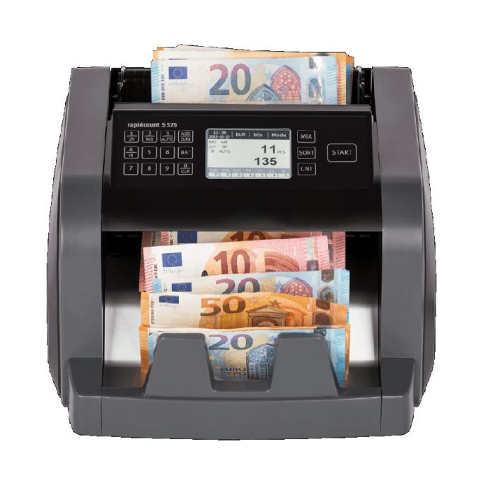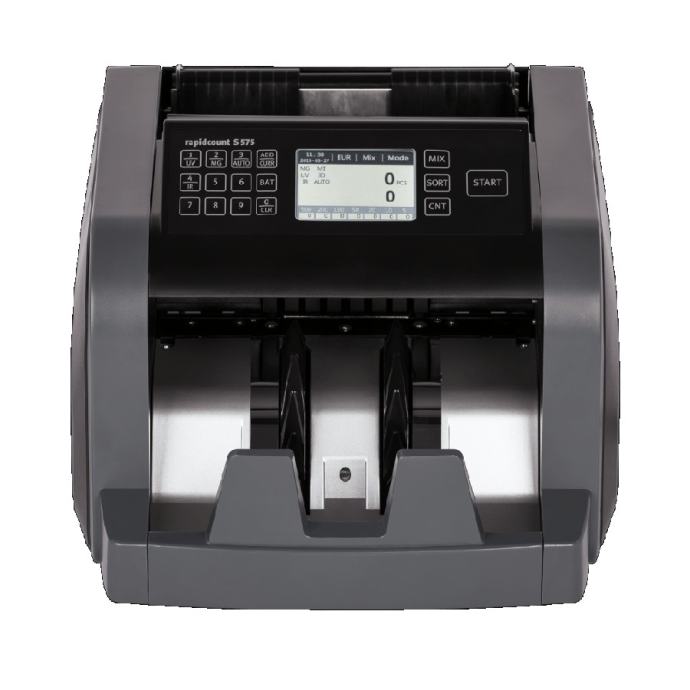Naš novi brojač Euro novčanica za male količine - rapidcount S 575. Brojač vrijednosti i komada s kombiniranom detekcijom krivotvorina izračunava ne samo količinu nego i točnu vrijednost Euro novčanica.