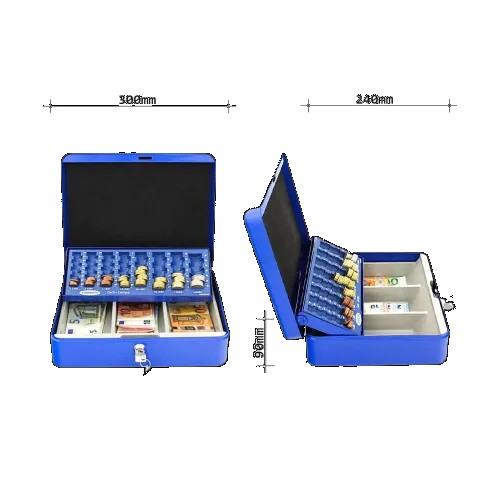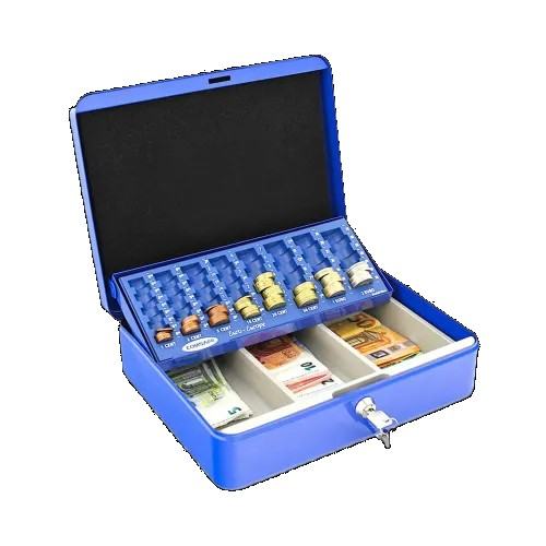 Praktična kasa Wien u plavoj boji opremljena je stalkom za brojanje Euro kovanica i pretincem za Euro novčanice. Na vrhu se nalazi sklopiva ručka koja olakšava transport kase. Sigurnosna cilindrična brava se pouzdano zatvara i opremljena je s 2 ključa. Stalak za brojanje kovanica automatski se uvlači kada se poklopac otvori. Kasa za novac Wien dostupna je i u drugim bojama.