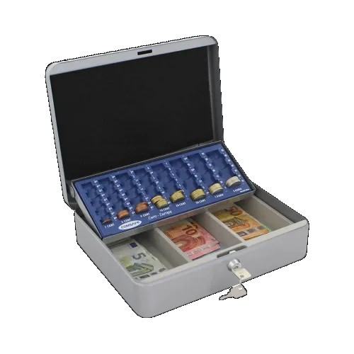 Praktična kasa Wien u boji srebra opremljena je stalkom za brojanje Euro kovanica i pretincem za Euro novčanice. Na vrhu se nalazi sklopiva ručka koja olakšava transport kase. Sigurnosna cilindrična brava se pouzdano zatvara i opremljena je s 2 ključa. Stalak za brojanje kovanica automatski se uvlači kada se poklopac otvori. Kasa za novac Wien dostupna je i u drugim bojama.