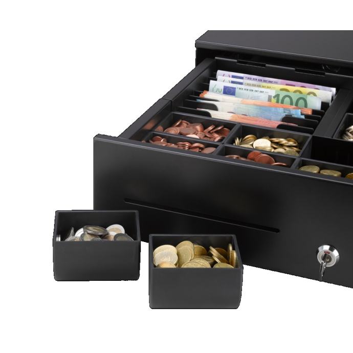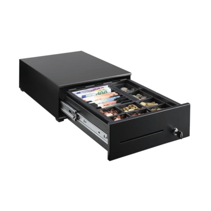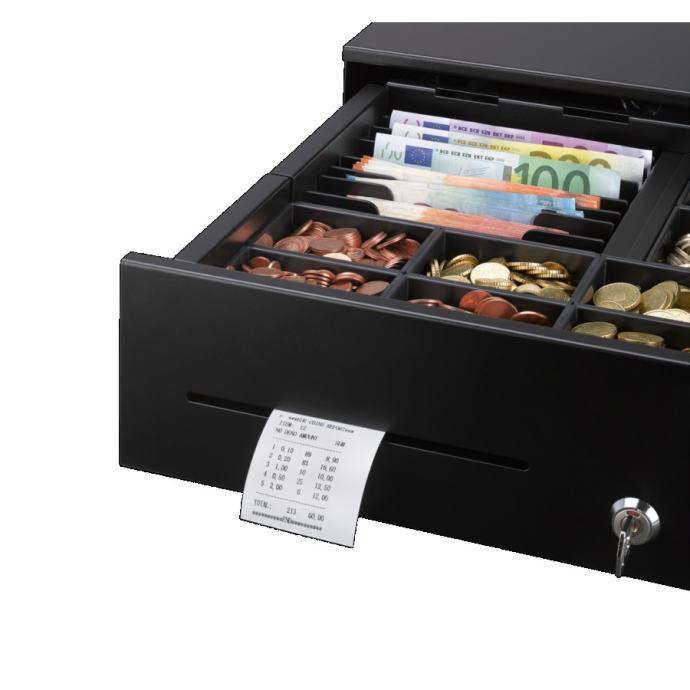 Idealno za sigurne gotovinske transakcije na POS-u - naša elektronska teleskopska ladica za gotovinu RCD 350 s visokokvalitetnom teleskopskom tračnicom na valjkastim ležajevima.