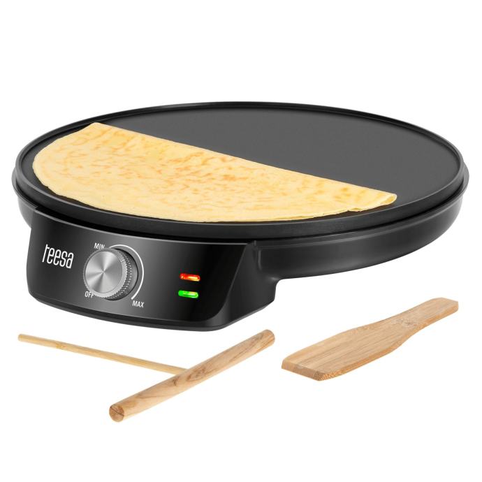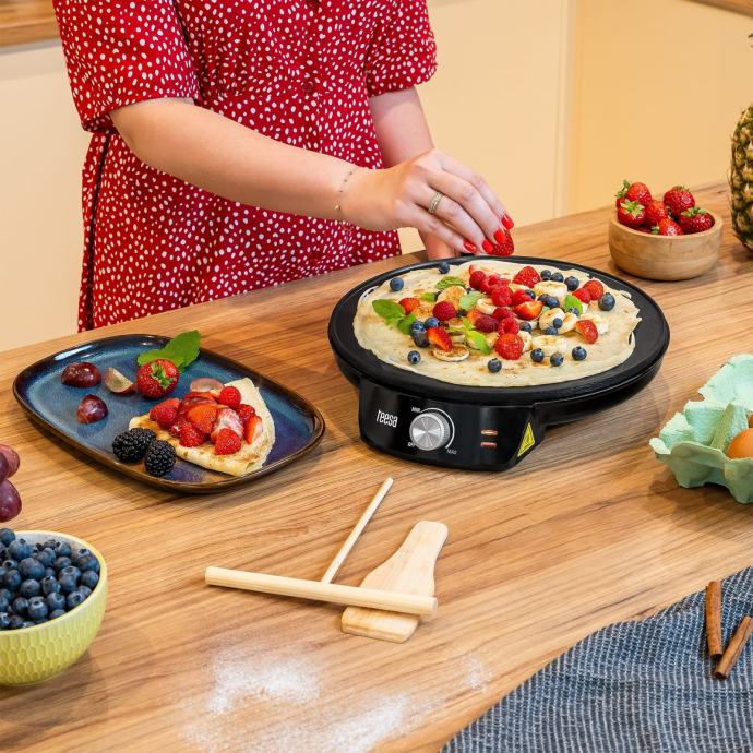 Uživajte u savršeno pečenim palačinkama i tortiljama s posudom za pečenje od 1200 W koja ima promjer od 30 cm i elegantnog crnog dizajna. Ovaj visoki izvršni uređaj dizajniran je za jednostavnu i brzu pripremu ukusnih domaćih palačinki, tortilje, omleta i drugih jela, bez napora.