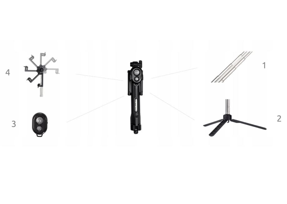 Skup sadrži monopod koji se može rastaviti na postolju (kao stajalište) i daljinskom upravljaču. Promjena načina je jednostavna i zahtijeva samo nekoliko poteza. Izvucite ručicu daljinskog upravljača, ispružite noge i zaključajte glavu.