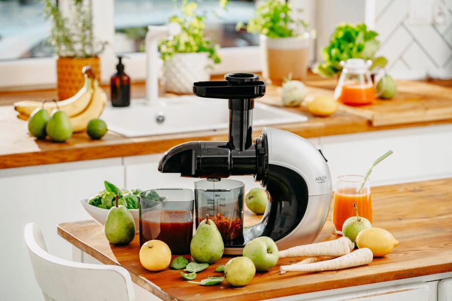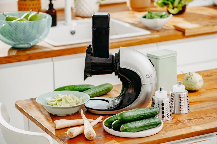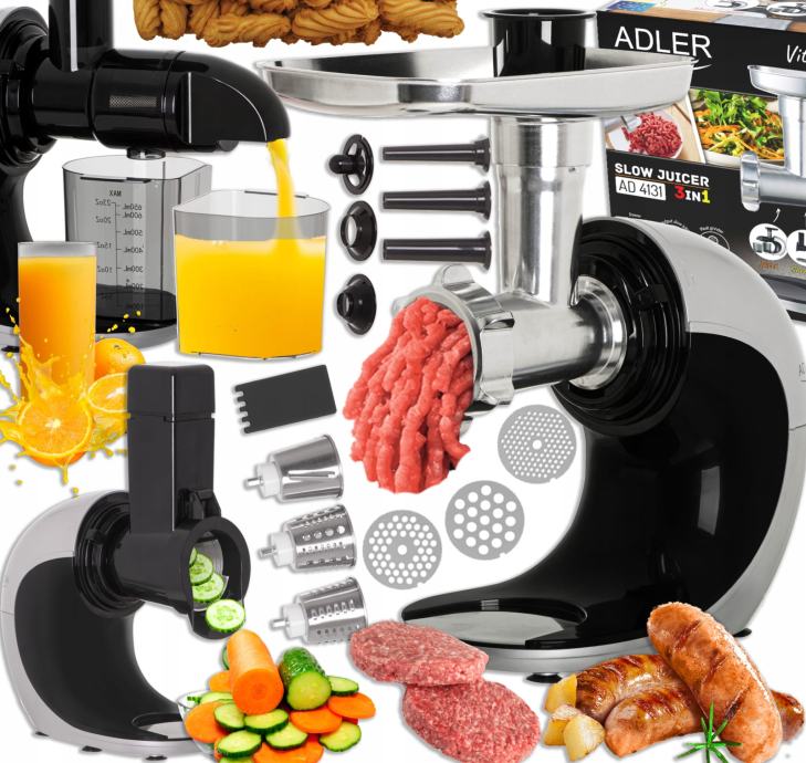 Višenamjenska i kompaktnost: Otkrijte svestranost kuhinje s Adlerovim AD 4131, Appliance 3 u 1, koji kombinira spor sokovnik, brusilicu za rezanje mesa i povrća. Njegovo kompaktno kućište, široko samo 15 cm, savršeno se uklapa u bilo koji kuhinjski prostor bez zauzimanja puno prostora.