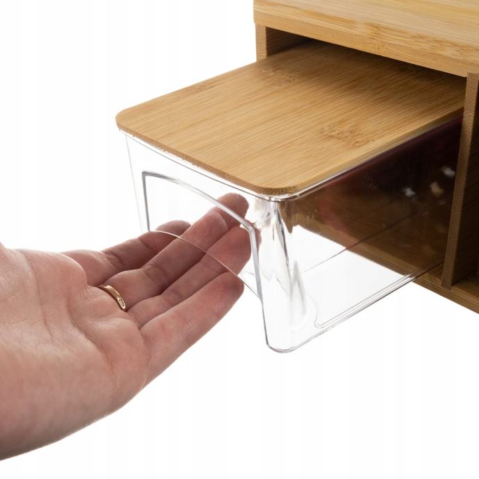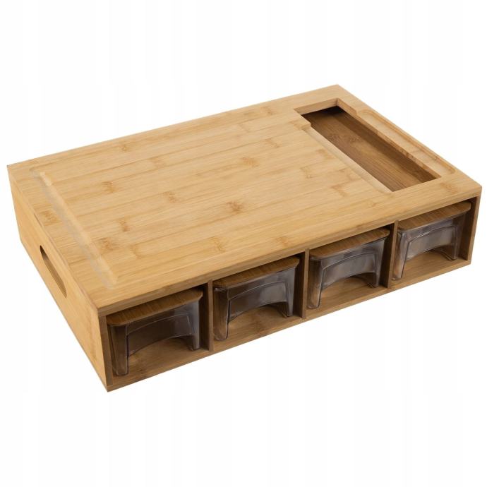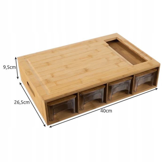 Specifikacija -bambus/plastični/metalni materijal; Broj spremnika: 4; Broj strugača: 4; Ručke za prijenos: Da; Dimenzije spremnika: 16 x 9 x 7 cm; Ukupna veličina: 40 x 26,5 x 9,5 cm; Težina: 2.666;