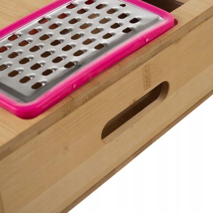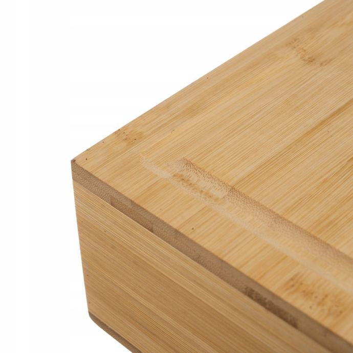 Prirodno bambusovo drvo -Bambusova kuhinjska ploča ima jednostavan oblik, koji se također prenosi u moderne kuhinje. Bambus je prikladan materijal za izradu kuhinjskih dodataka, jer je: otporan na vlagu, antibakterijski, lagan, siguran za zdravlje, ne apsorbira mirise, ne miješa boje, deformira i ima odgovarajuću tvrdoću.
