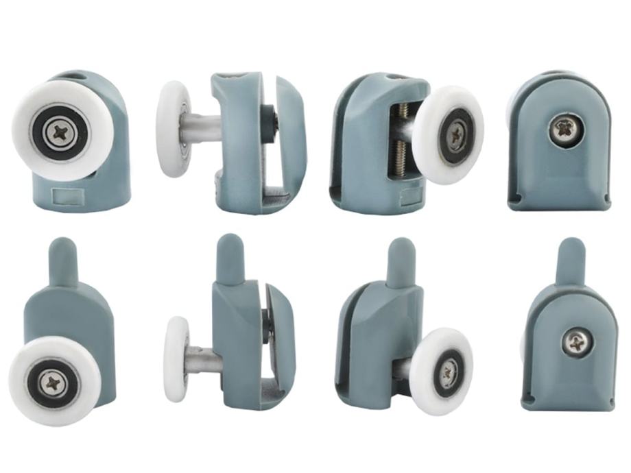 Gornji i donji kotači za tuš kabine s poklopcima i odbojnicima. Gornji cilindar ima podesivi element pričvršćivanja. Cilindri su montirani na ležajeve, prikladne za staklo debljine 4-6 mm i uklapaju se u različite vrste tuš kabina.
