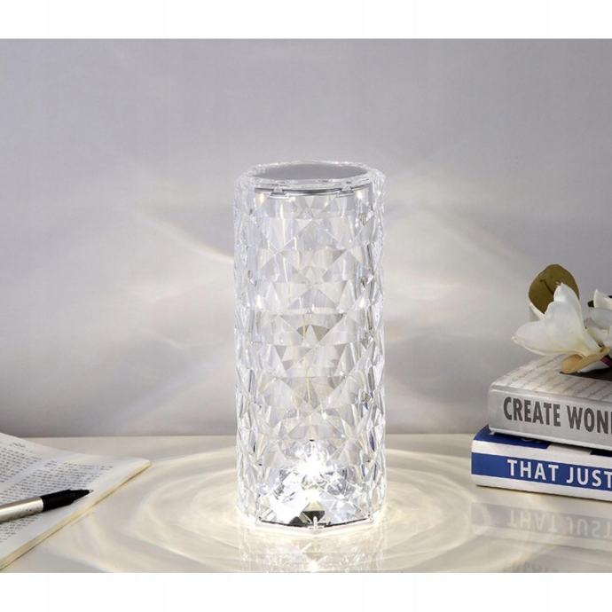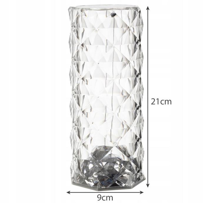 Specifikacija -kolor: bezbojna; Materijal: akril; Broj boja osvjetljenja: 16; Broj razine čvrstoće svjetlosti: 5; Funkcija prijelaza u boji: Da; Funkcija preskakanja boja: Da; Snaga: 400 mAh litij baterija; Punjenje: putem USB kabela; Vrsta svjetla: led; Snaga: 1W; Duljina kabela: 80 cm; Dimenzije svjetiljke: 9 x 21 cm; Težina: 273 g